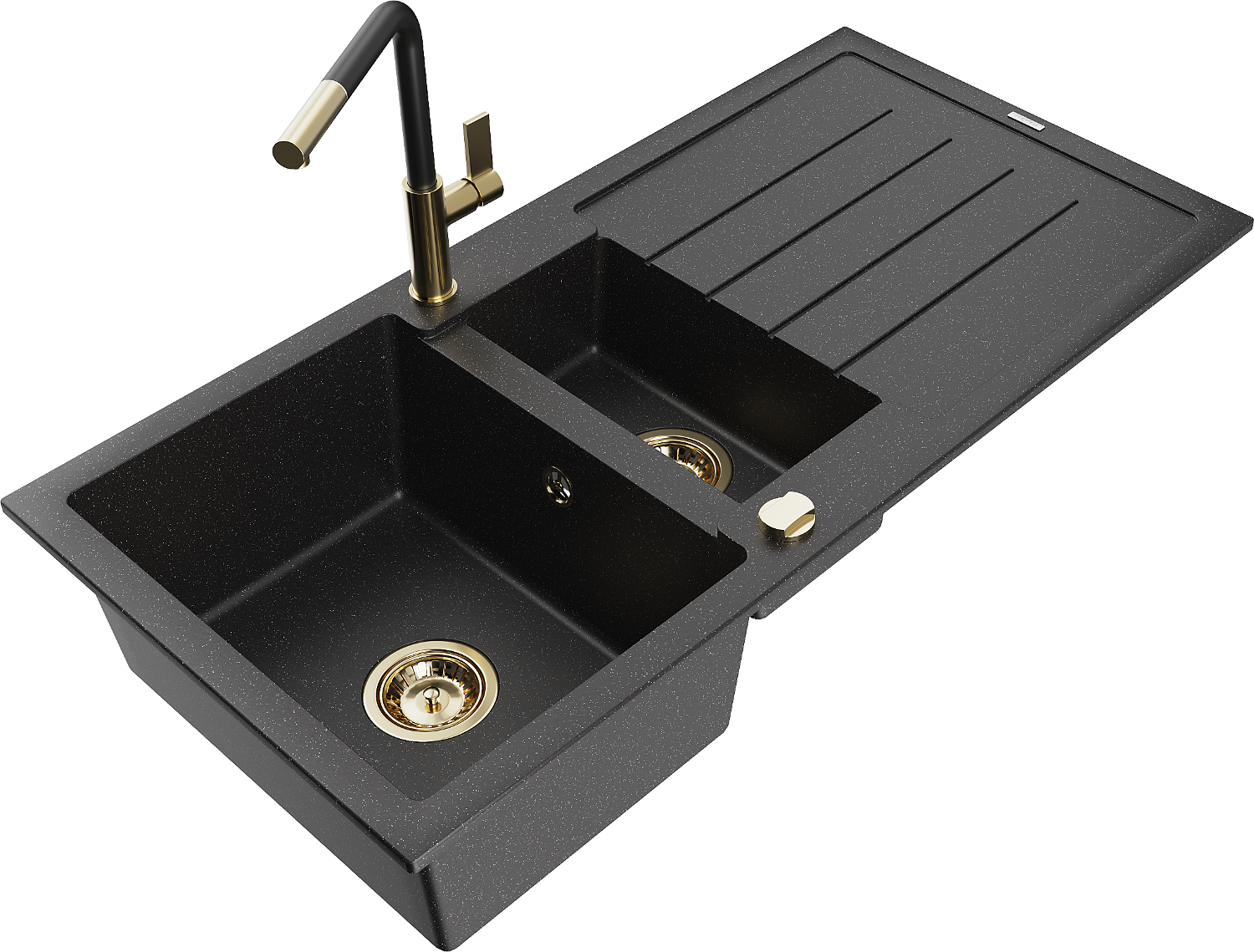 Mexen Andres chiuvetă de bucătărie din granit cu 1,5 compartimente, cu scurgător și baterie Flora, negru/argintiu