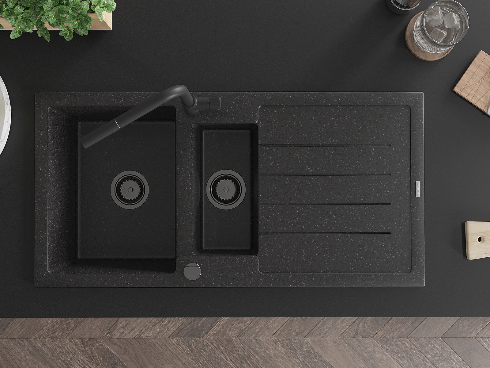 Mexen Andres chiuvetă de bucătărie din granit cu 1,5 cuve cu scurgător și baterie Flora, negru/argintiu - 6515-73-670401-70-B