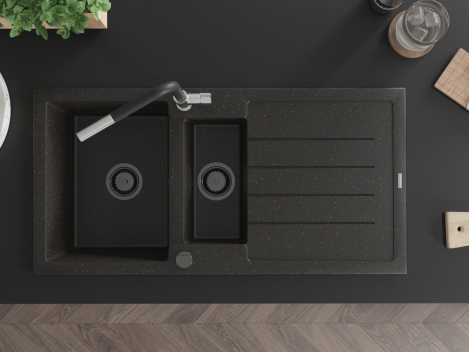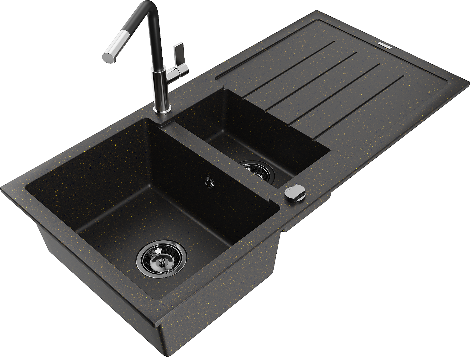Mexen Andres chiuvetă din granit cu 1,5 compartimente cu scurgător și baterie de bucătărie Flora, negru/auriu