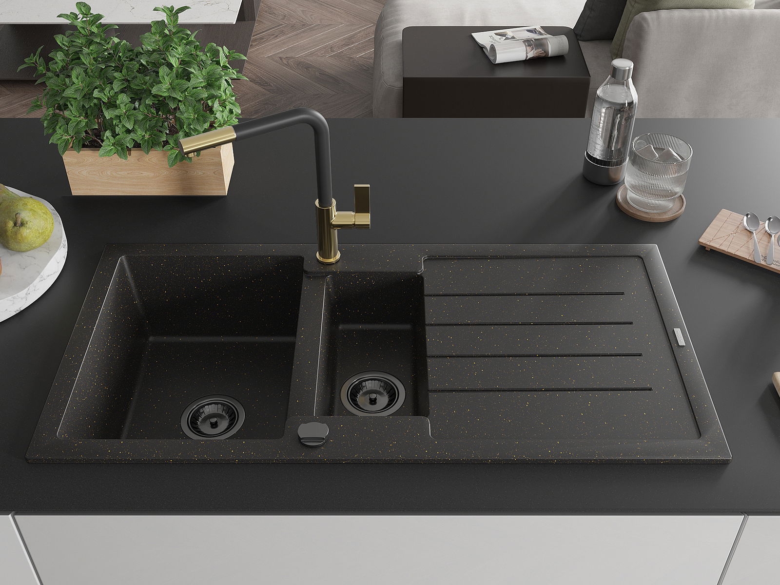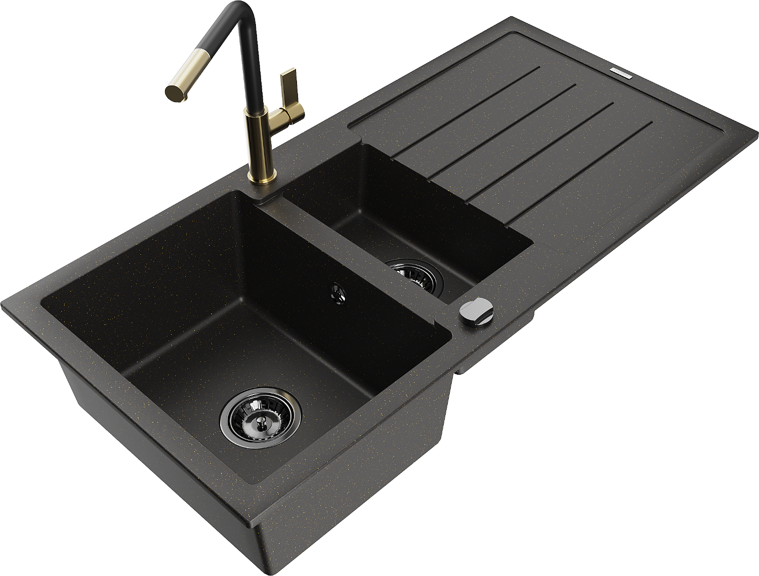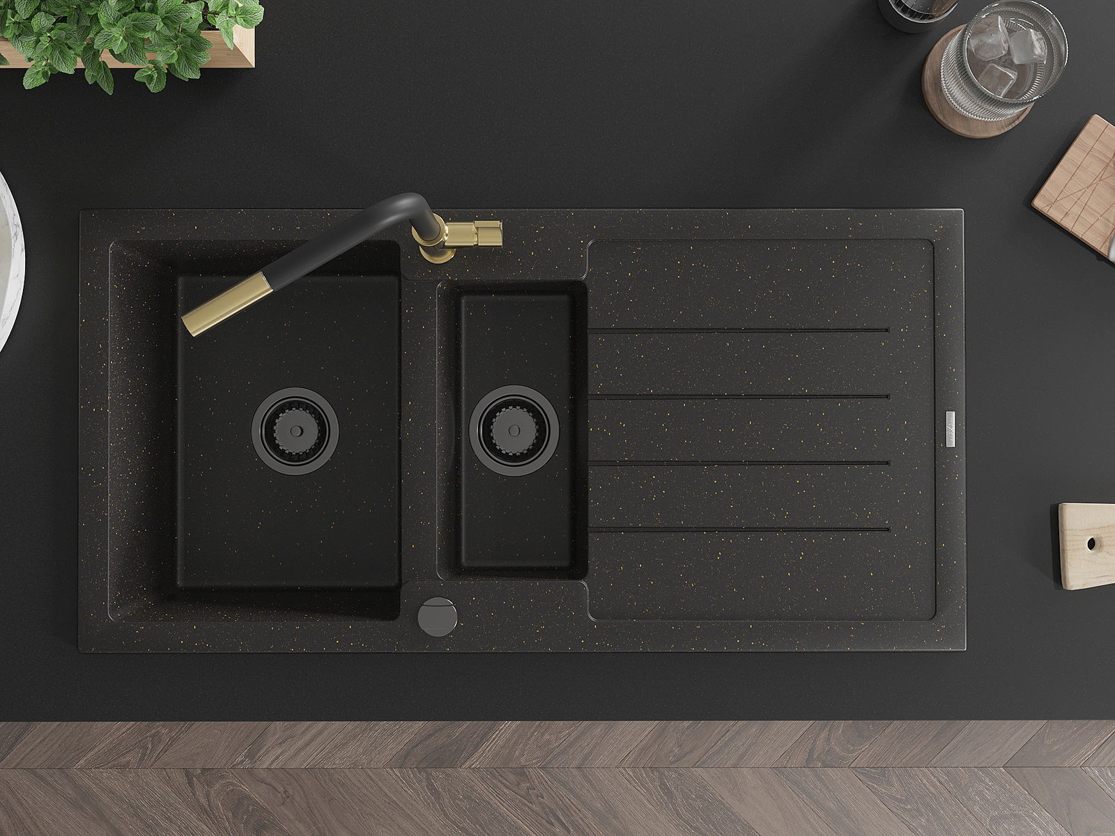 Mexen Andres chiuvetă de granit cu 1,5 cuve, cu picurător și baterie de bucătărie Flora, negru/auriu - 6515-75-670401-57-B