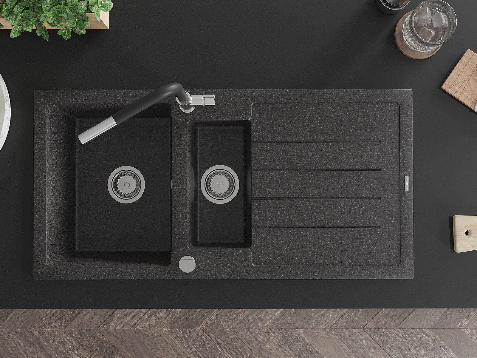 Mexen Andres chiuvetă din granit cu 1,5 compartimente cu scurgător și baterie de bucătărie Flora, negru cu pete - 6515-76-67040?
