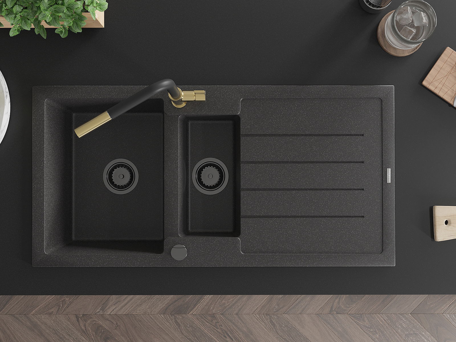 Chiuveta are 2 orificii frezate de 35 mm în diametru, care pot fi perforate manual. Acestea pot fi utilizate, printre altele, pentru instalarea unui dozator de detergent, care va elimina prezența sticlelor de plastic din bucătărie și va oferi un finisaj elegant.