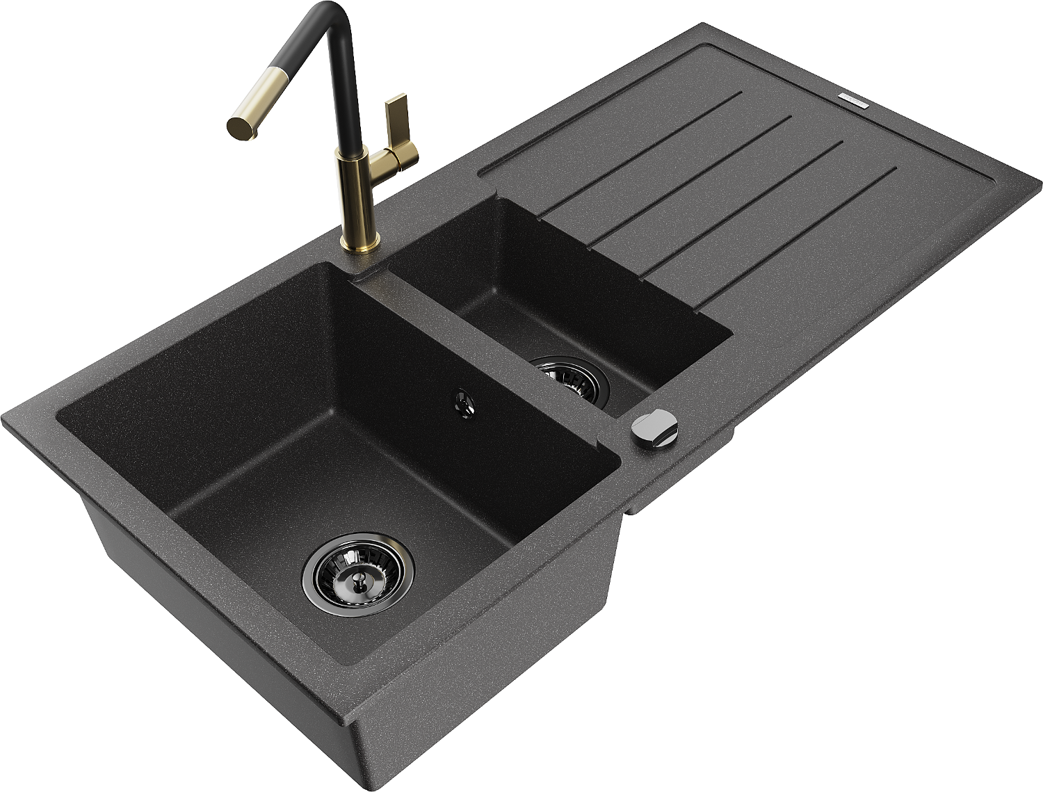 Mexen Andres chiuvetă de bucătărie din granit, cu 1,5 compartimente și scurgător, cu baterie Flora, negru cu pete
