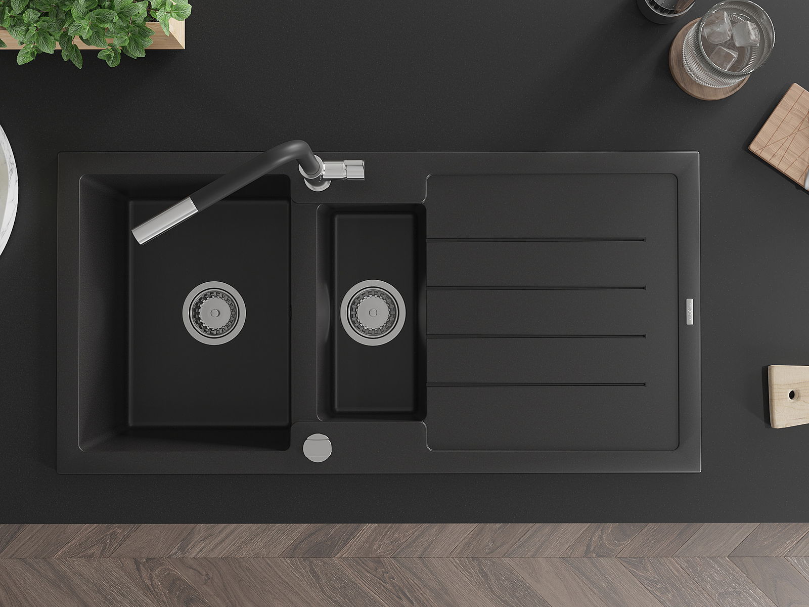 Datorită sistemului de montare universală, chiuveta este reversibilă, iar scurgerea poate fi montată pe blat la stânga sau la dreapta. În acest fel, puteți ajusta cu ușurință pagina la nevoile și condițiile dvs.