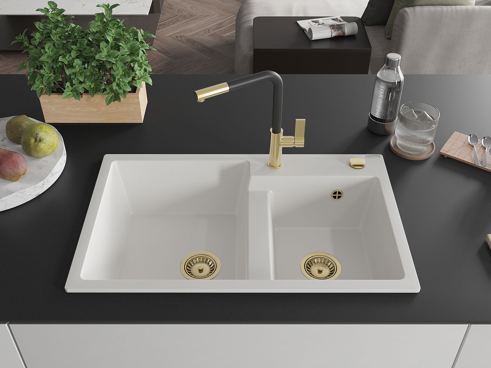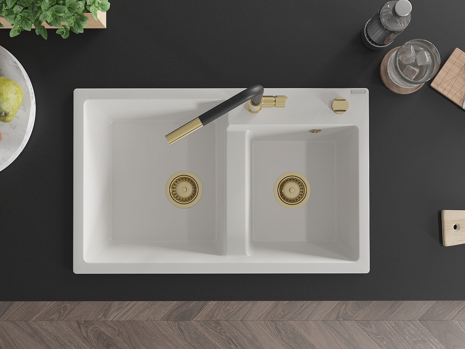 Mexen Tomas chiuvetă de granit cu 2 compartimente cu baterie de bucătărie Flora, alb - 6516-20-670401-57-G