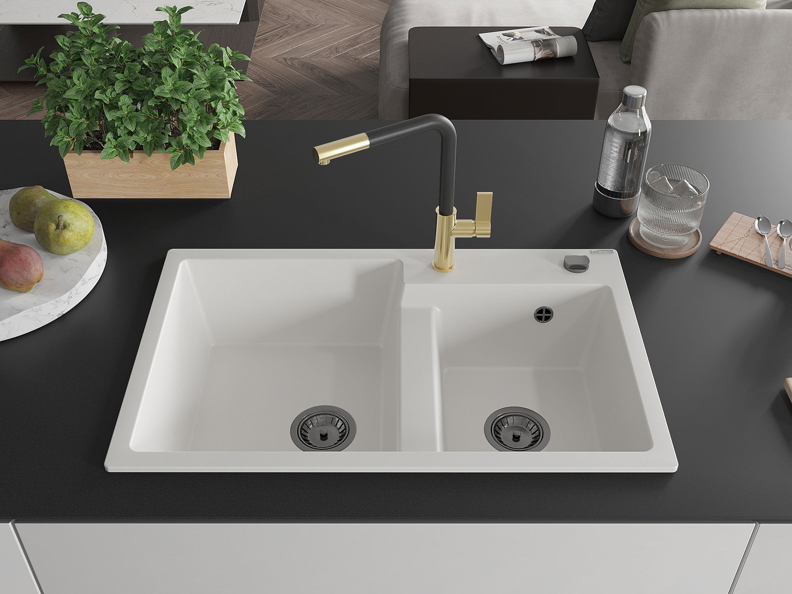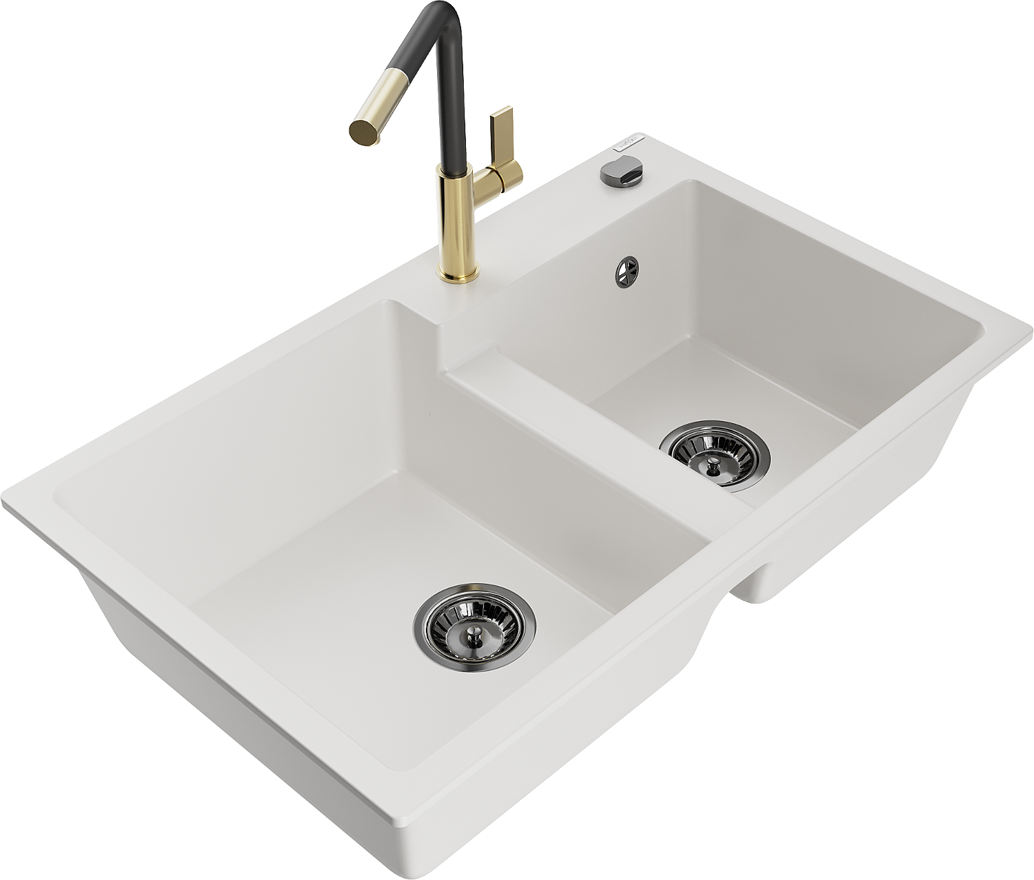 Mexen Tomas chiuvetă de granit cu 2 cuve cu baterie de bucătărie Flora, alb - 6516-20-670401-57-B