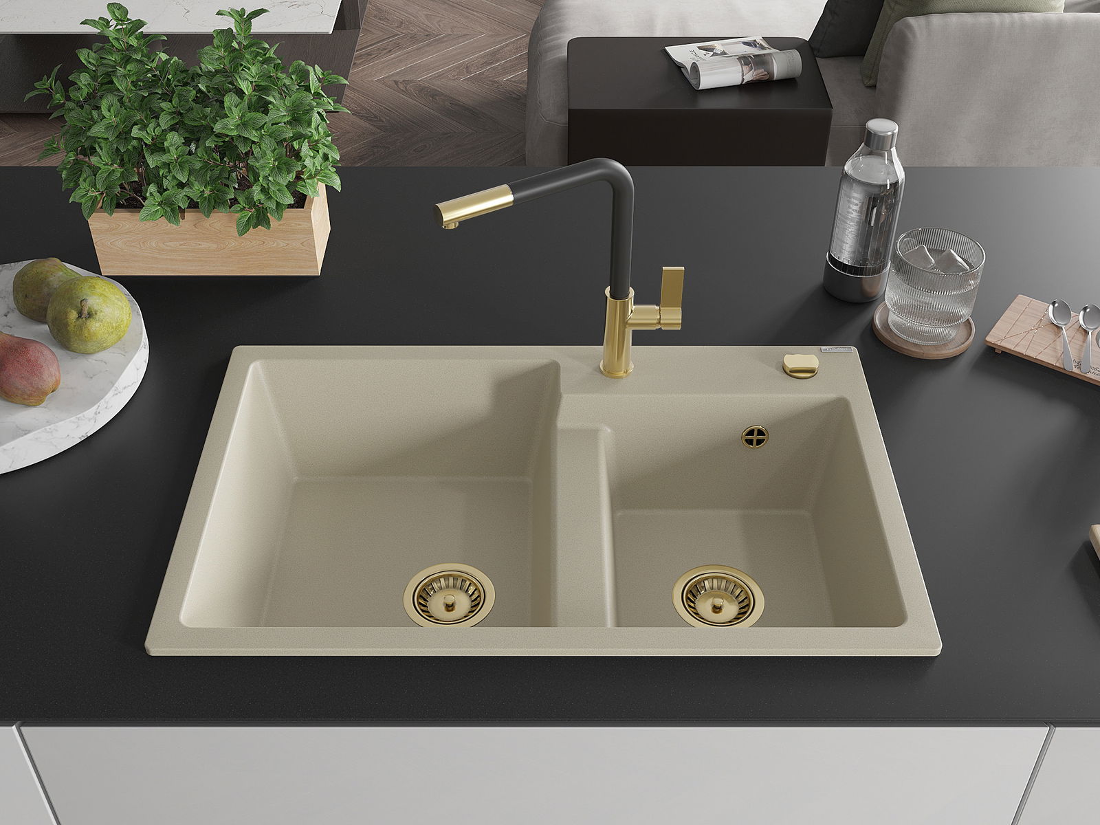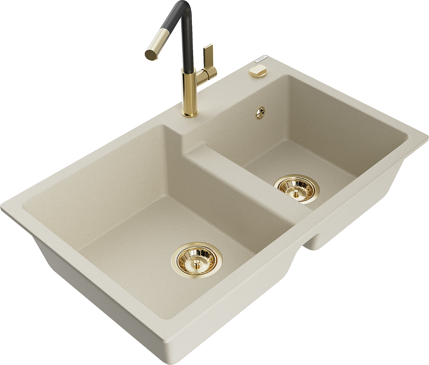 Mexen Tomas chiuvetă de bucătărie granit cu 2 compartimente și baterie Flora, bej - 6516-69-670401-57-G