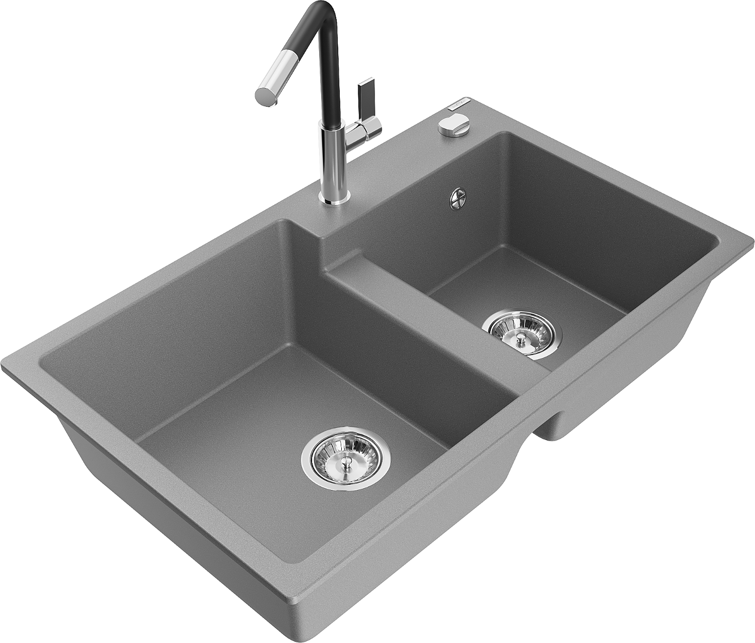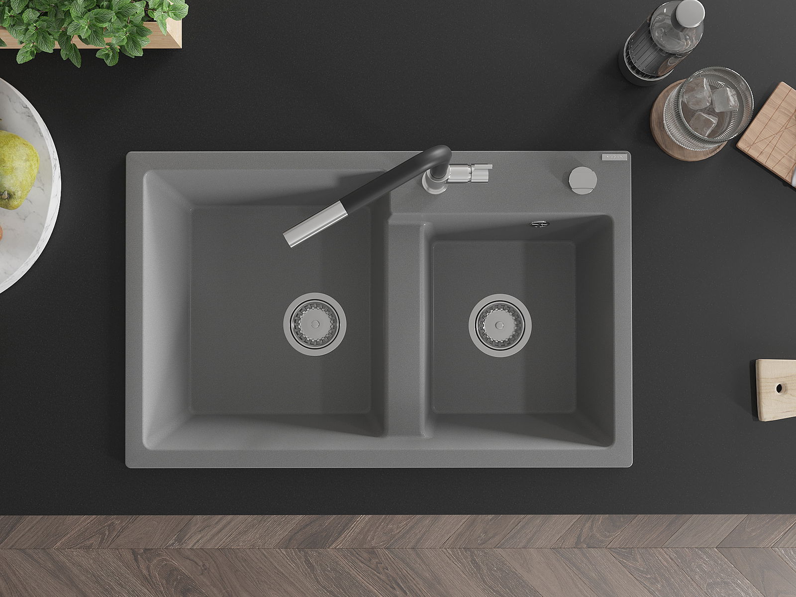 Mexen Tomas chiuvetă de bucătărie din granit cu 2 cuve și baterie Flora, gri - 6516-71-670401-07