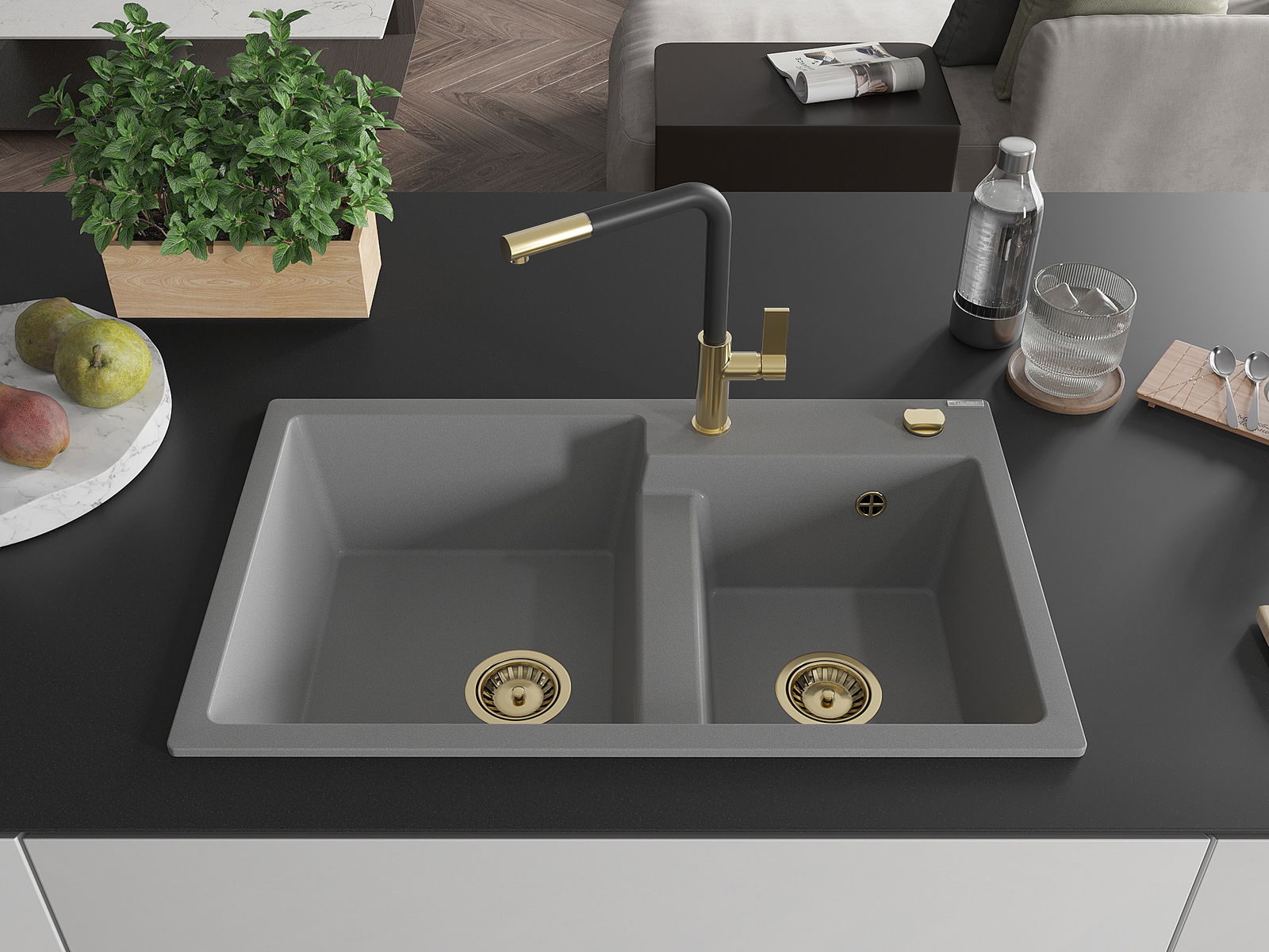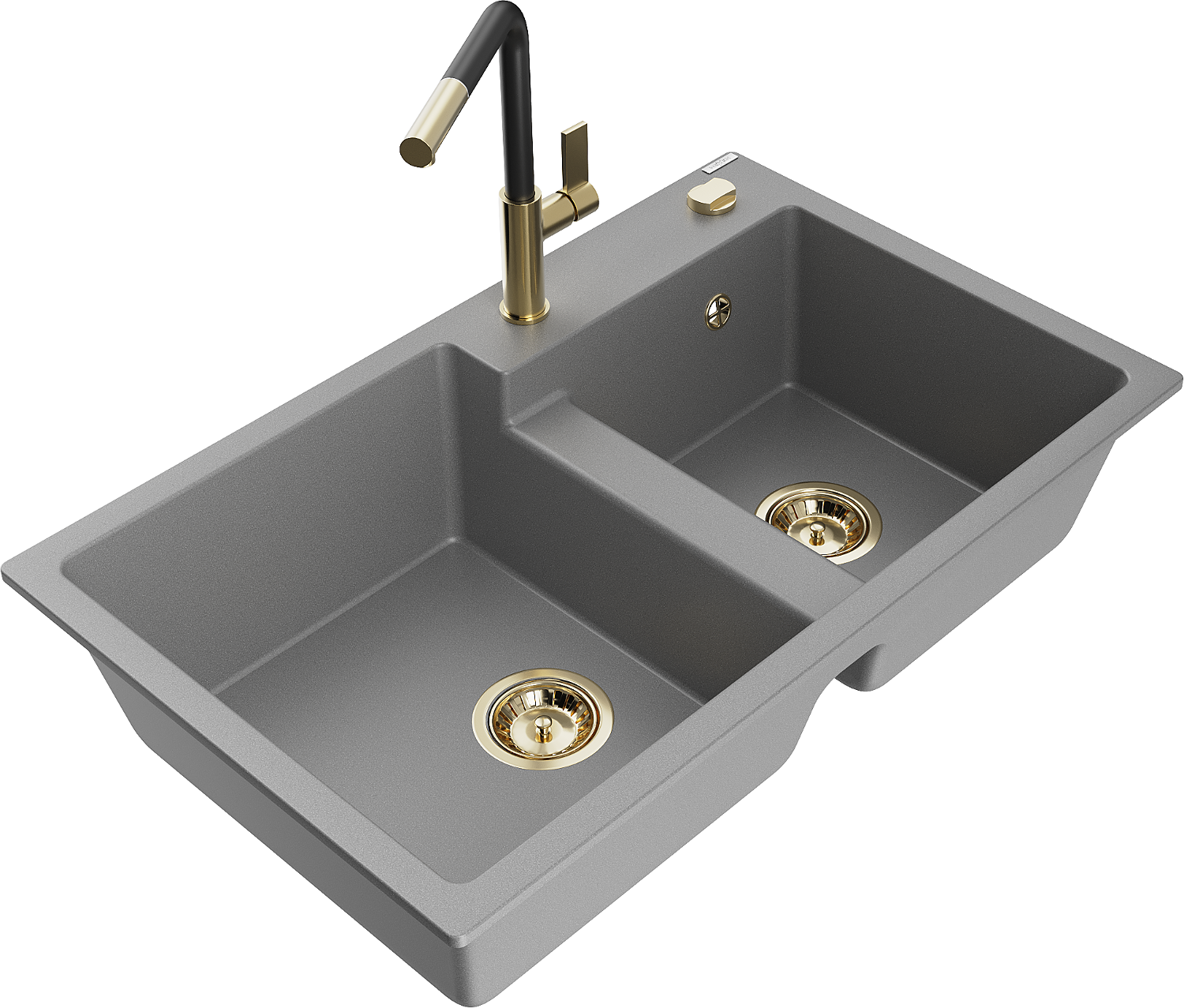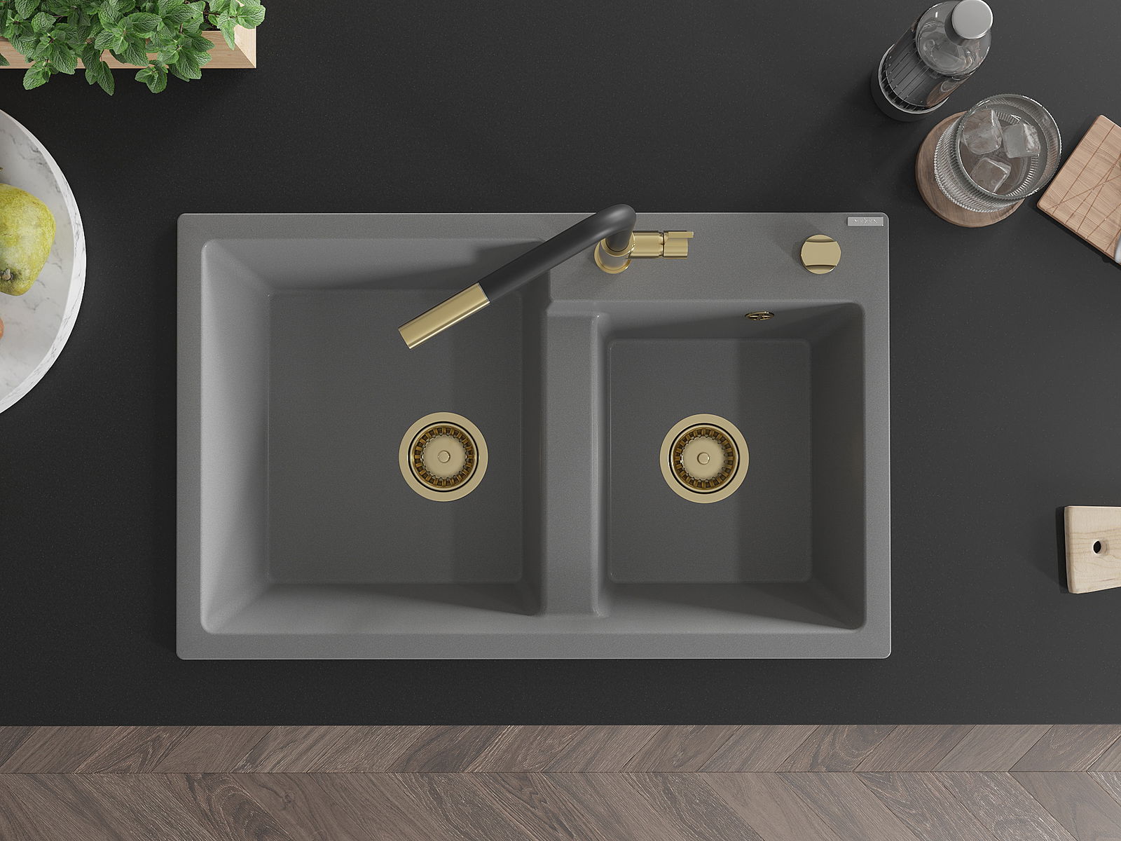 Mexen Tomas chiuvetă de granit cu 2 compartimente și baterie de bucătărie Flora, gri - 6516-71-670401-57-G