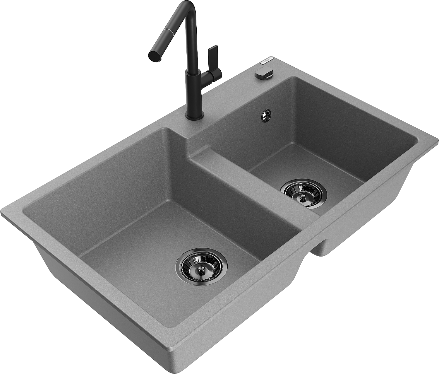 Mexen Tomas chiuvetă de bucătărie din granit cu 2 compartimente și baterie Flora, gri - 6516-71-670401-70-B