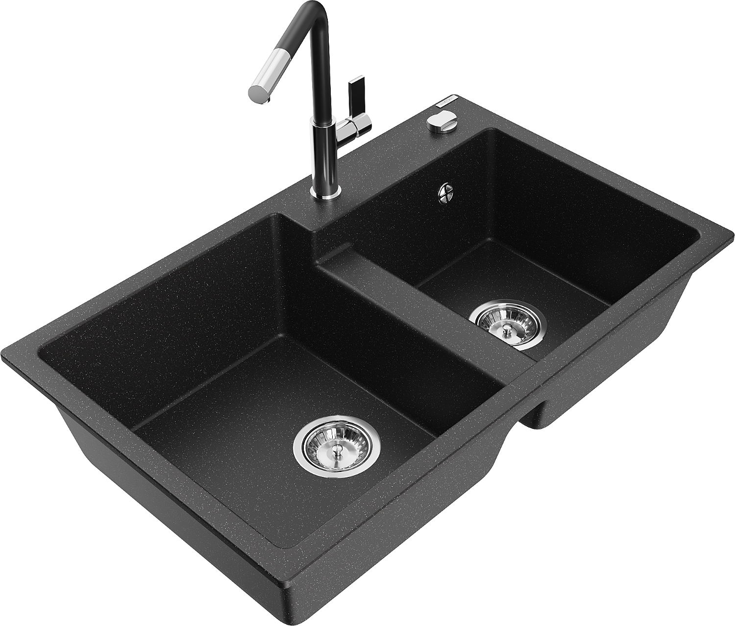 Mexen Tomas chiuvetă de granit cu 2 compartimente și baterie de bucătărie Flora, negru/metalizat argintiu - 6516-73-670401-07