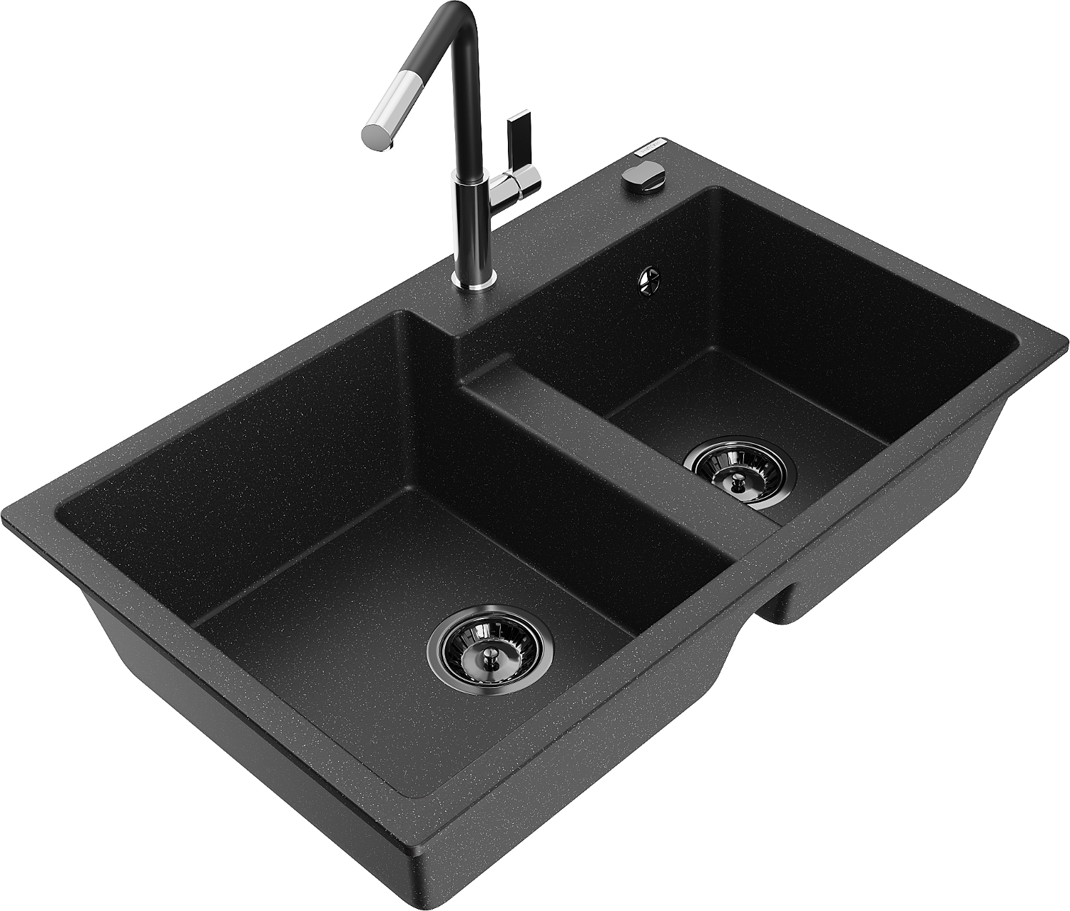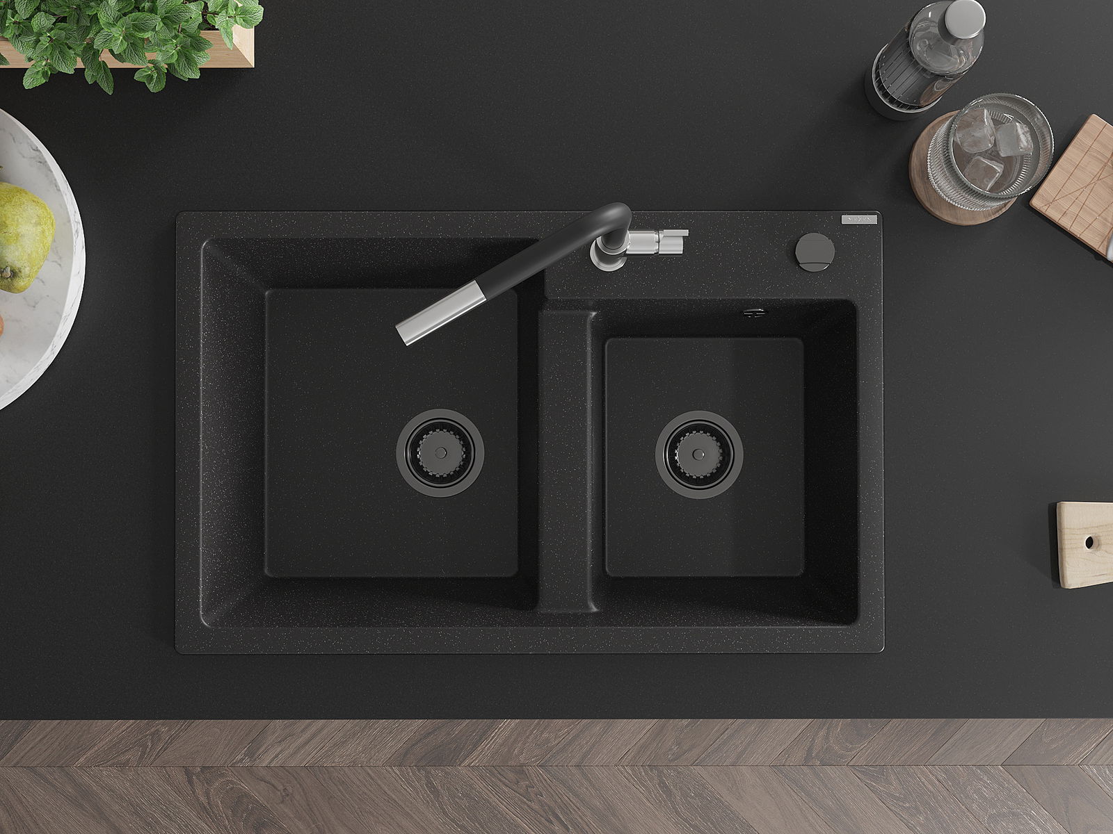 Mexen Tomas chiuvetă de bucătărie din granit cu 2 compartimente cu baterie de bucătărie Flora, negru/metalic argintiu