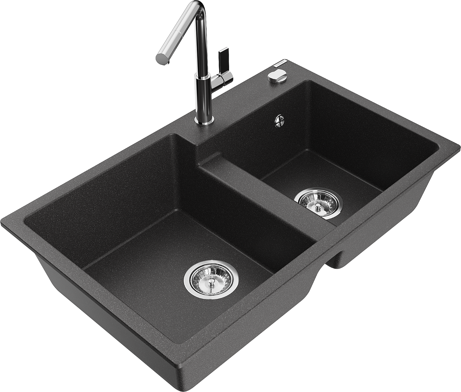 Mexen Tomas chiuvetă de granit cu 2 compartimente și baterie de bucătărie Flora, negru cu puncte - 6516-76-670401-00