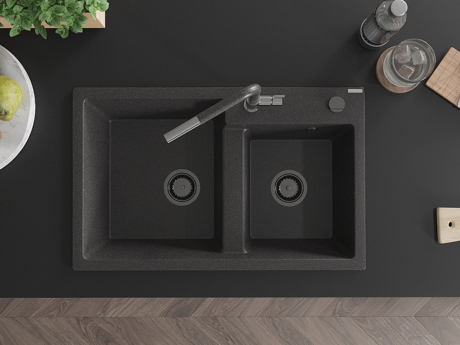 Mexen Tomas chiuvetă de granit cu 2 compartimente cu baterie de bucătărie Flora, negru cu stropi - 6516-76-670401-08-B