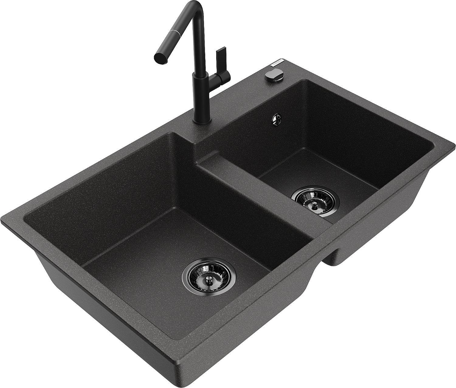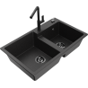 Mexen Tomas chiuvetă de bucătărie din granit cu 2 compartimente și baterie Flora, negru pătat - 6516-76-670401-70-B