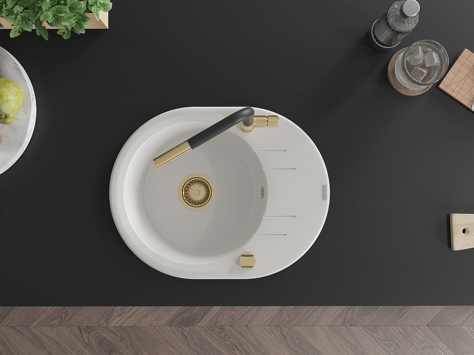 Mexen Kevin chiuvetă de granit cu 1 compartiment cu picurător și baterie de bucătărie Flora, alb - 6517-20-670401-57-G