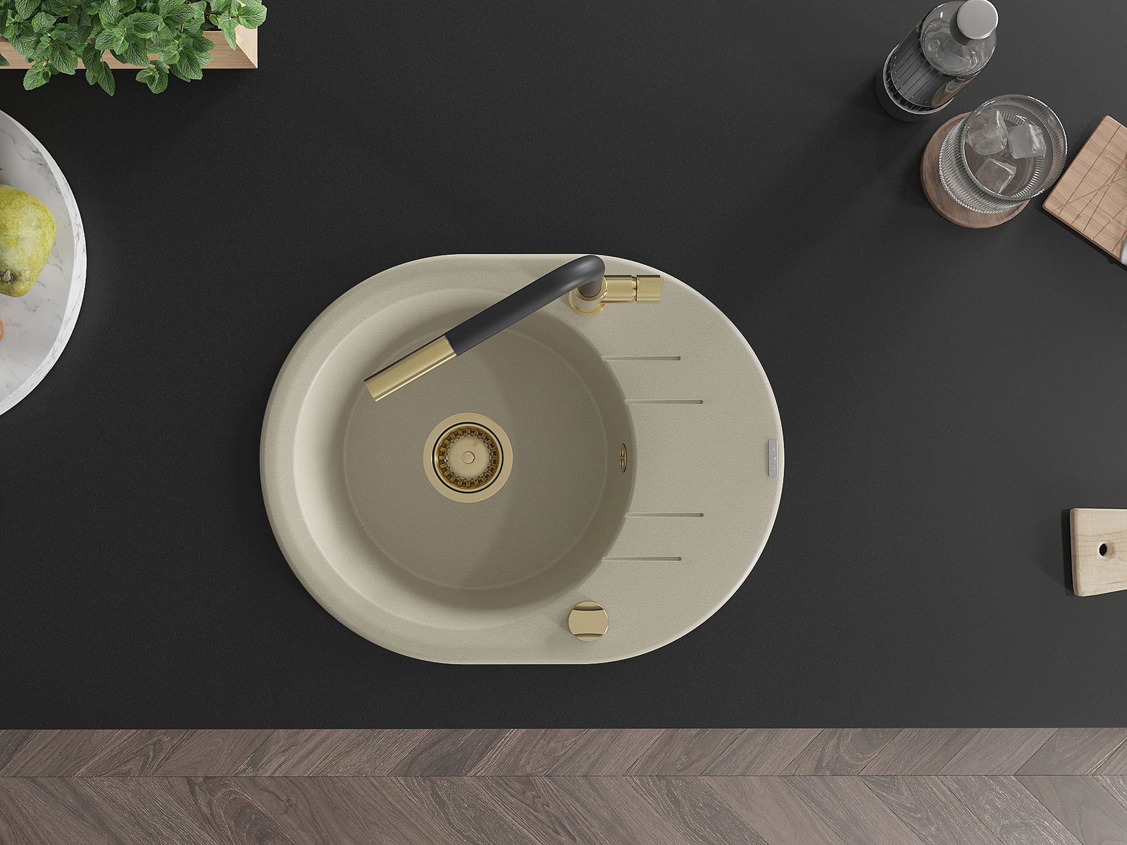 Mexen Kevin chiuvetă de granit cu 1 compartiment cu scurgător și baterie de bucătărie Flora, bej - 6517-69-670401-57-G