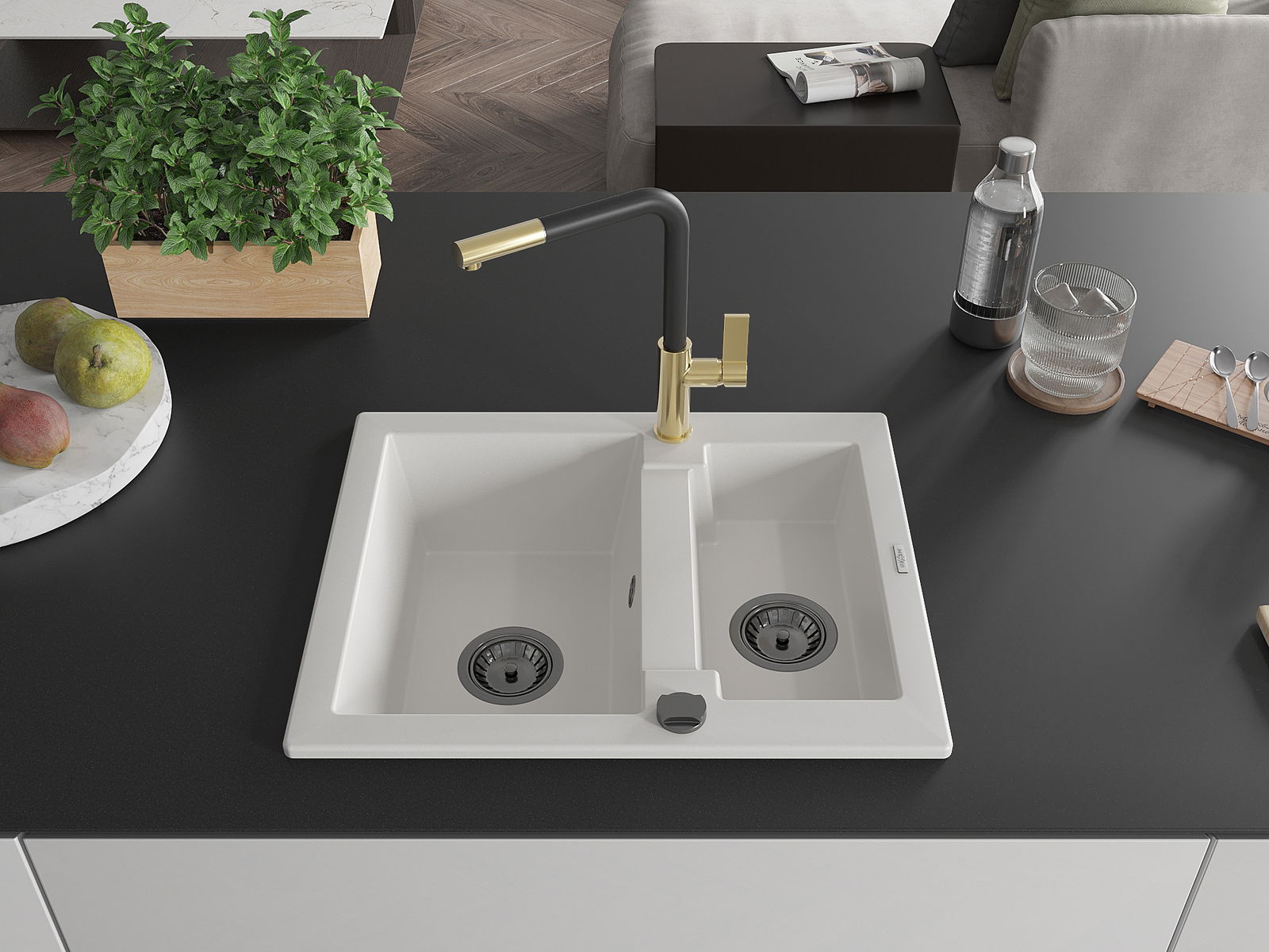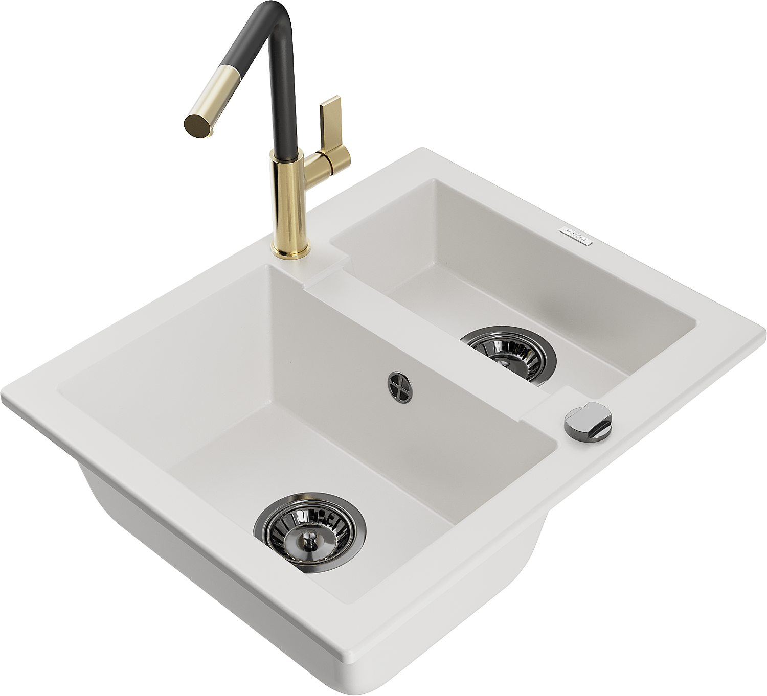 Mexen Carlos chiuvetă de granit 1,5-camera cu baterie de bucătărie Flora, alb - 6518-20-670401-57-B