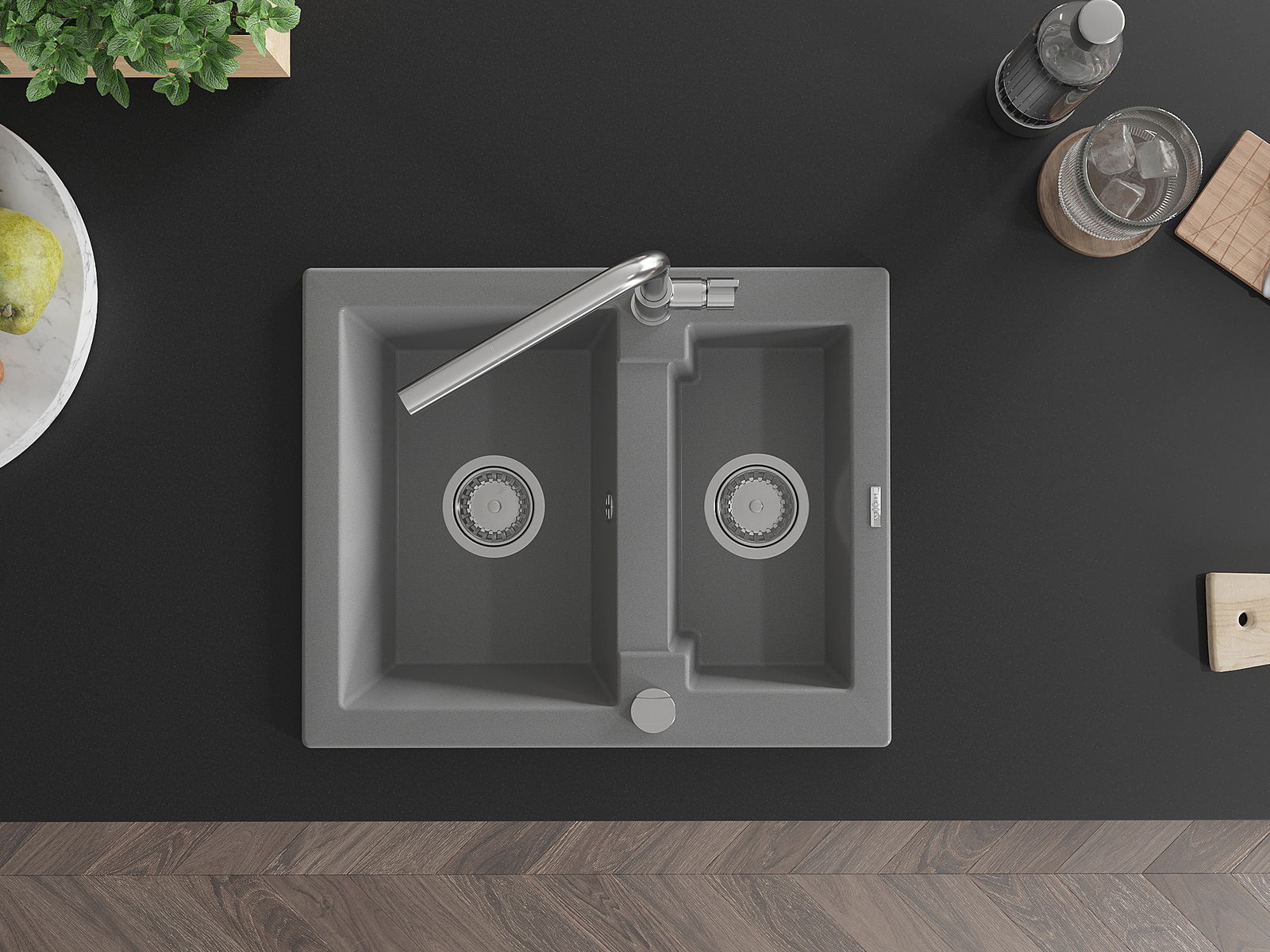 Mexen Carlos chiuvetă de granit cu 1,5 cuve cu baterie de bucătărie Flora, gri - 6518-71-670401-00