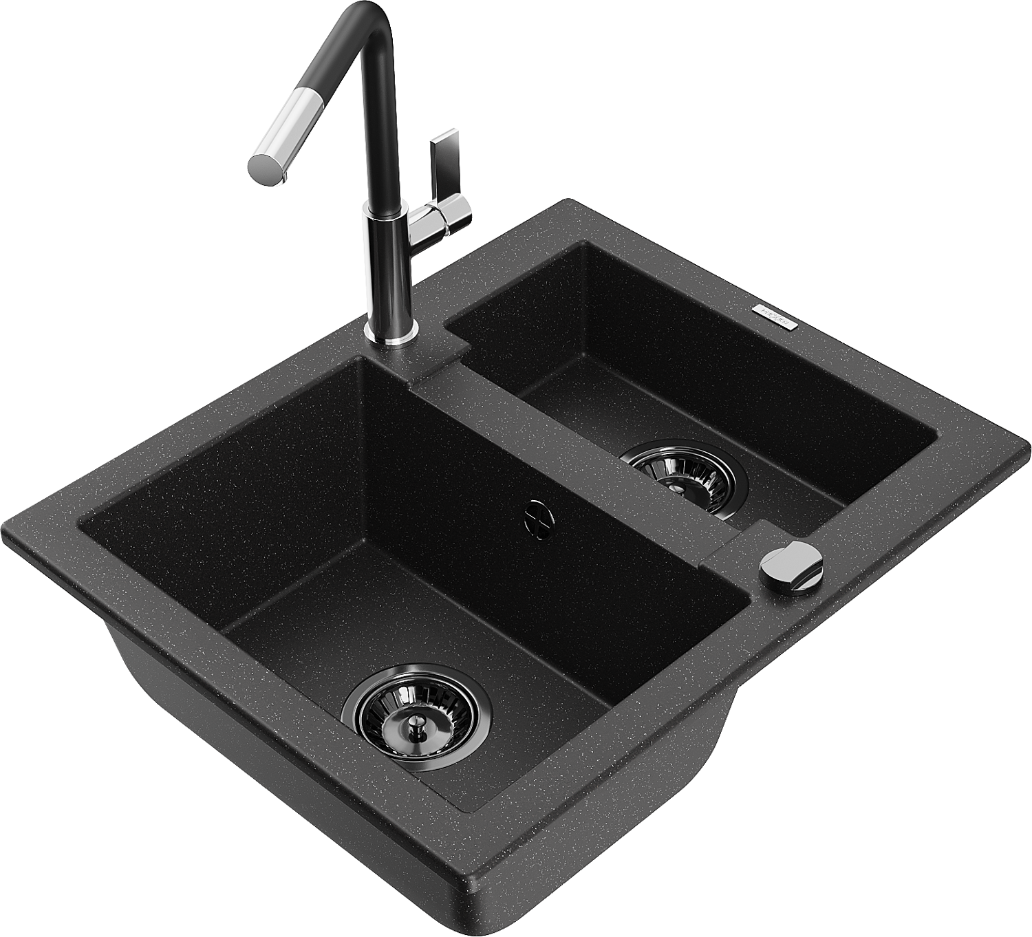 Mexen Carlos chiuvetă de bucătărie din granit cu 1,5 cuve cu baterie Flora, negru/argintiu metalizat - 6518-73-670401-07-B