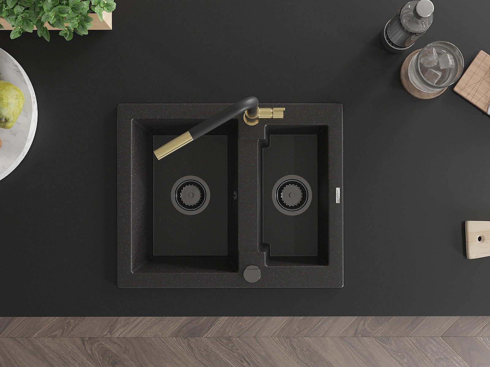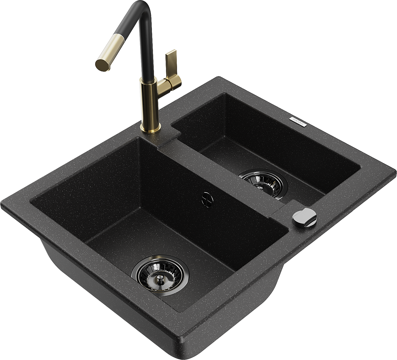Mexen Carlos chiuvetă din granit cu 1,5 compartimente şi baterie de bucătărie Flora, negru/argintiu metalizat