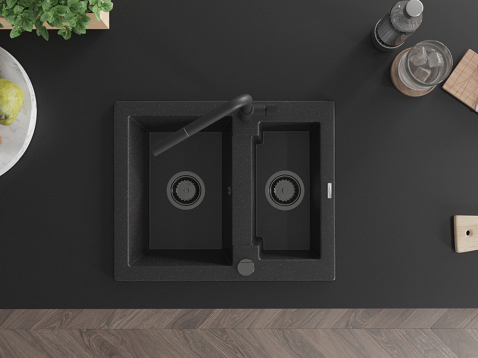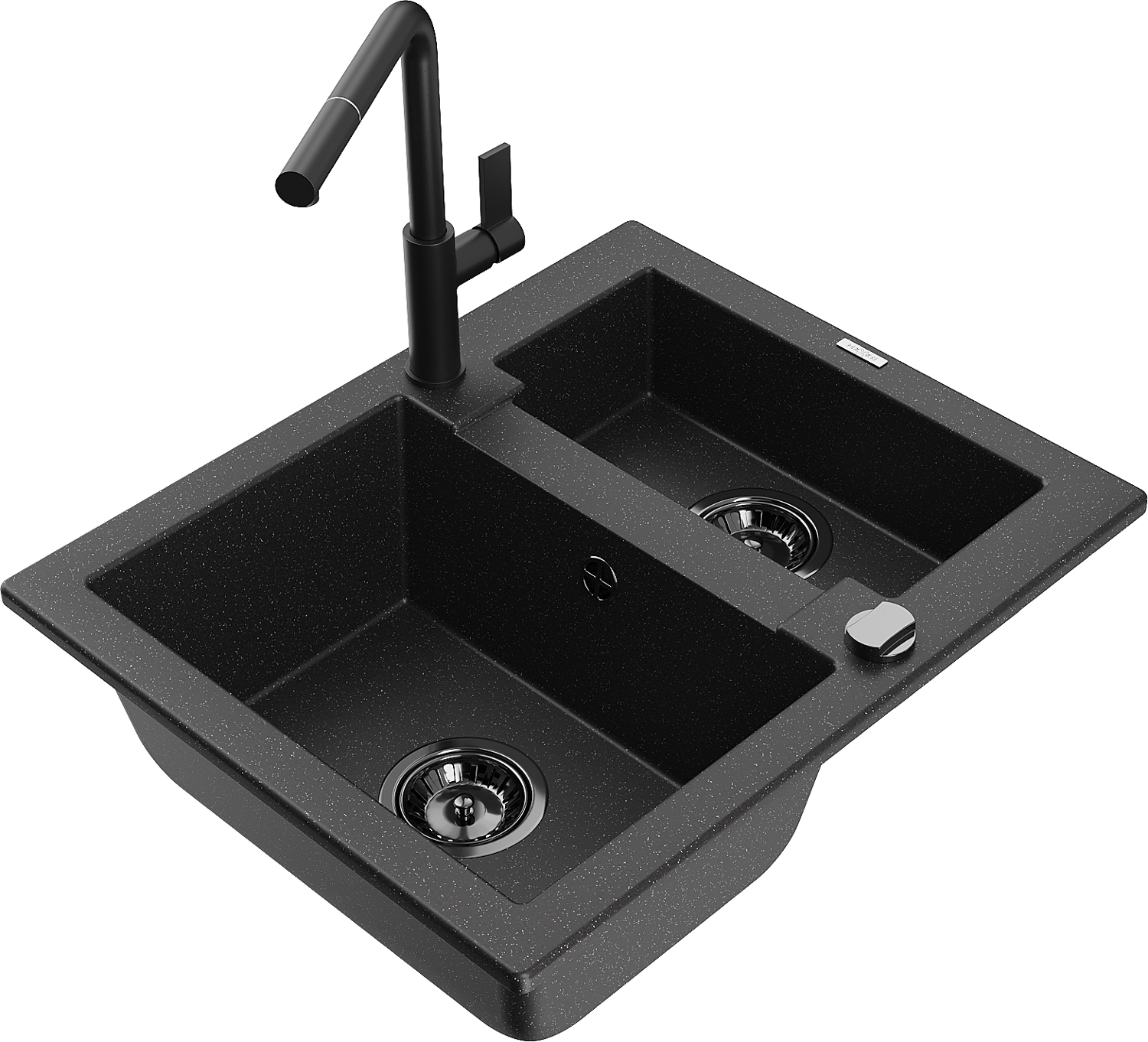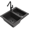 Mexen Carlos chiuvetă de granit cu 1,5 cuve și baterie de bucătărie Flora, negru/argintiu metalic - 6518-73-670401-70-B