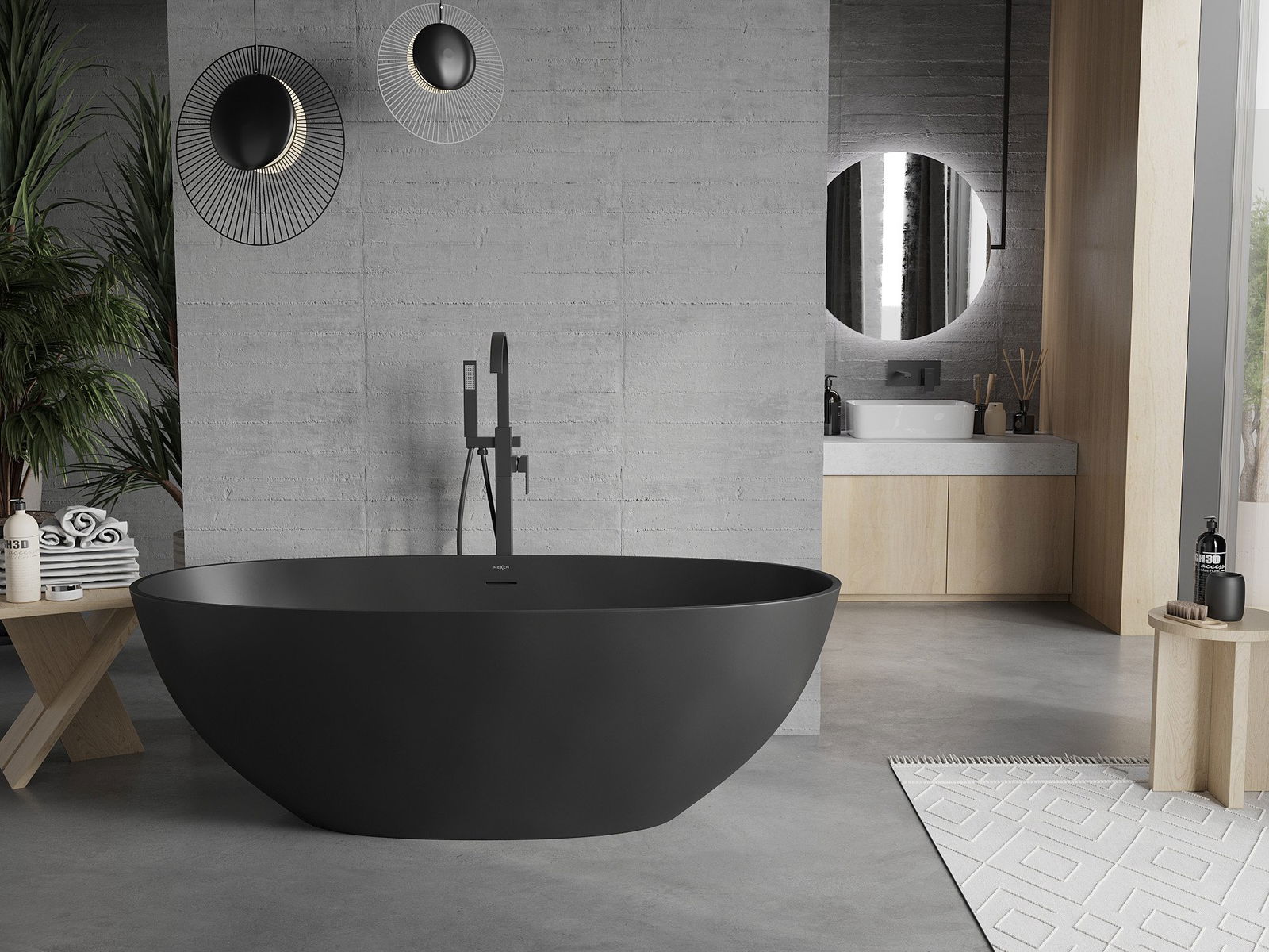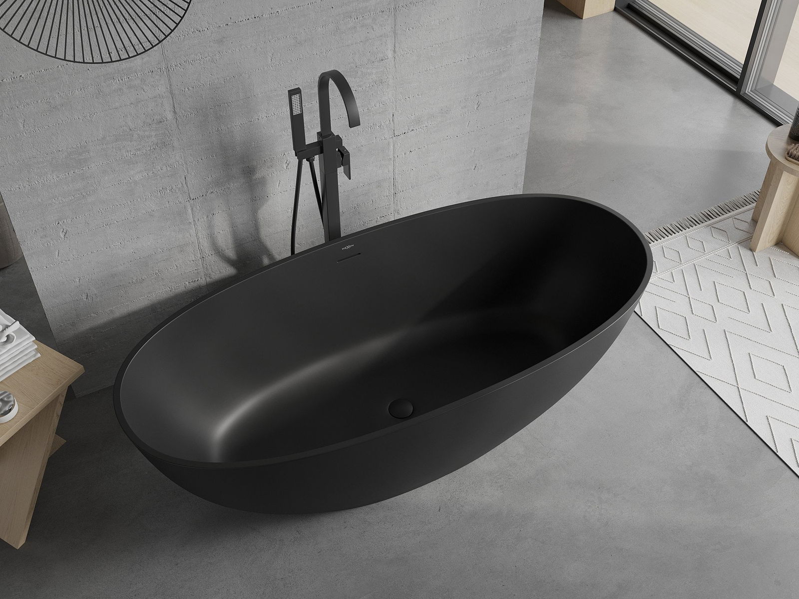 Cadă de sine stătătoare 165 x 75 cm din conglomerat este o alegere excelentă pentru iubitorii designului modern. Forma sa ovală și finisajul mat în culoarea neagră atrag atenția, adăugând eleganță fiecărei băi. Produsul este rezistent la matifiere și radiații UV, asigurând o utilizare de lungă durată. În plus, cada este echipată cu un preaplin practic și un sifon cu dop click-clack, pentru un confort sporit în utilizare. Înălțimea de 55 cm și adâncimea de 43 cm garantează confortul în timpul băii.