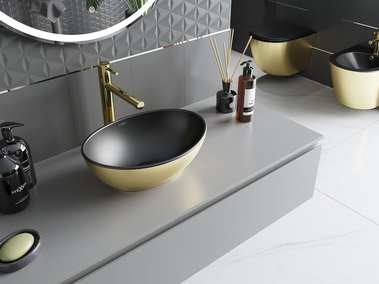 Suprafața mată a ceramicii subliniază perfect natura culorii produsului, oferindu -i un finisaj unic și expresiv. Structura subtilă a ceramicii mate introduce eleganță în baie, creând un spațiu estetic.