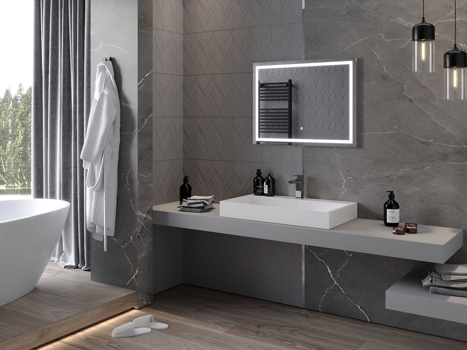 Iluminarea LED la oglindă este un element practic care facilitează îngrijirea zilnică, datorită posibilității de iluminare ideală a feței. Iluminarea oferă băii un finisaj modern, subliniind designul său elegant.