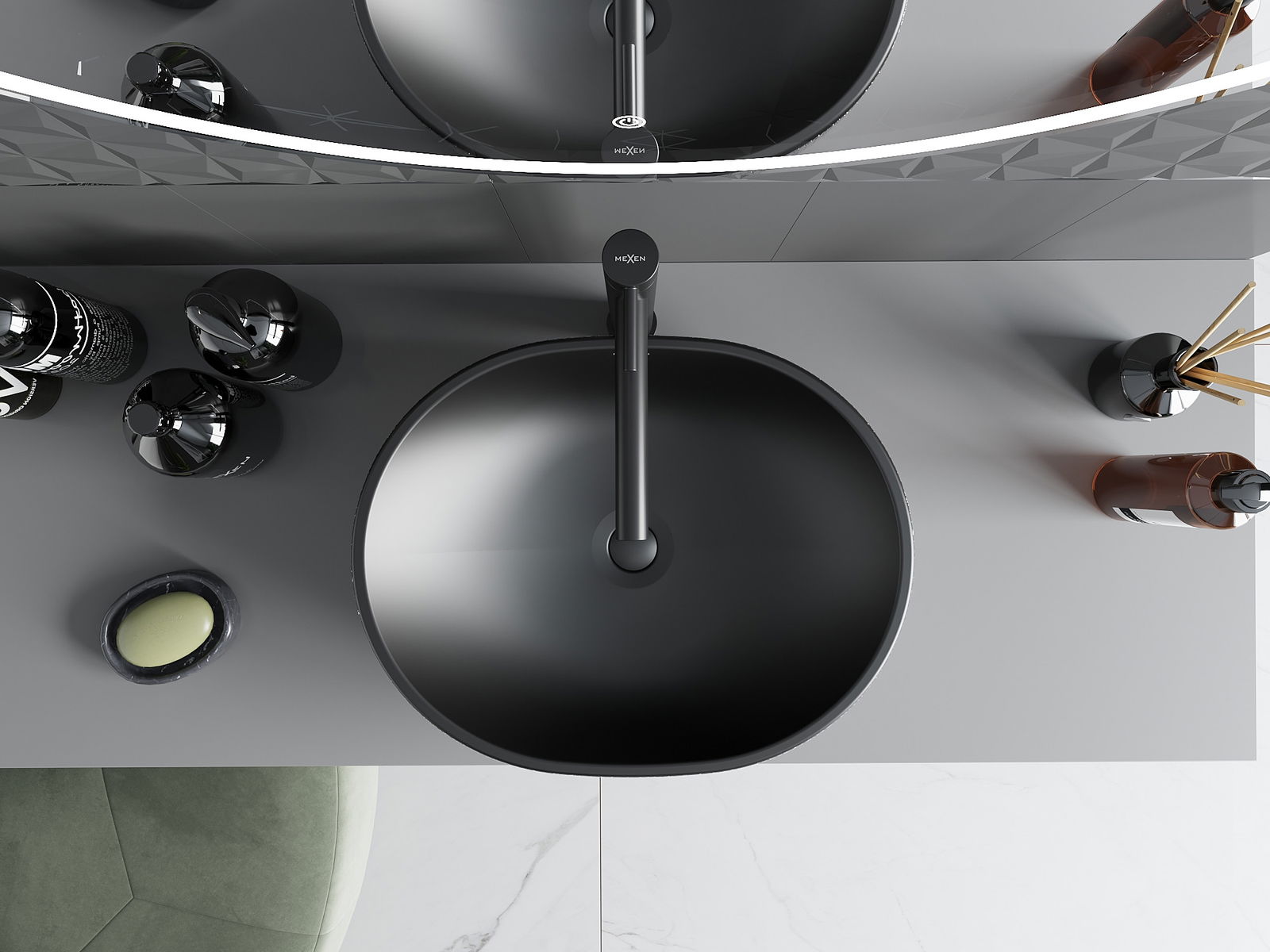 Chiuveta de baie pe blat Viki este combinația ideală de eleganță și funcționalitate. Oferă un design modern în culoare negru mat cu un pattern argintiu de solzi. Fabricată din ceramică sanitară durabilă, asigură rezistență la deteriorare. Forma sa ovală și dimensiunile de 48 x 35 x 14 cm o fac să se potrivească perfect în orice baie. Datorită suprafeței lucioase, nu doar că arată minunat, dar este și ușor de menținut curată. Lipsa orificiilor pentru baterie și preaplin îi adaugă un caracter minimalist.