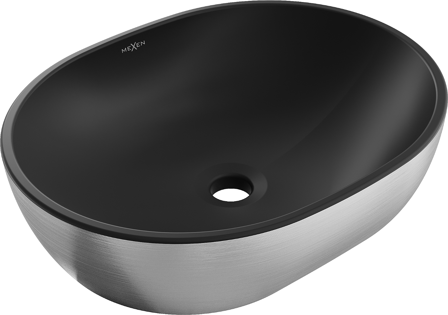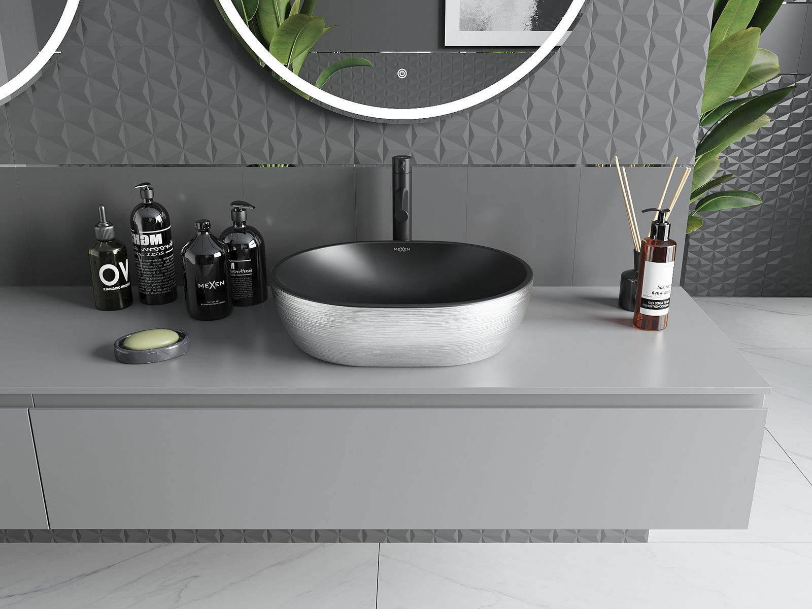 Chiuvetă de blat 48 x 35 cm într-un elegant negru mat cu model argintiu este combinația ideală de stil și funcționalitate. Fabricată din ceramică sanitară de înaltă calitate, se caracterizează printr-un strat protector, ceea ce asigură durabilitate și ușurință în curățare. Forma sa ovală și lipsa orificiilor pentru baterii și preaplin o fac o alegere excelentă pentru băile moderne. Dimensiunile compacte 48x35 cm și înălțimea de 14 cm permit o adaptare ușoară la diverse aranjamente.