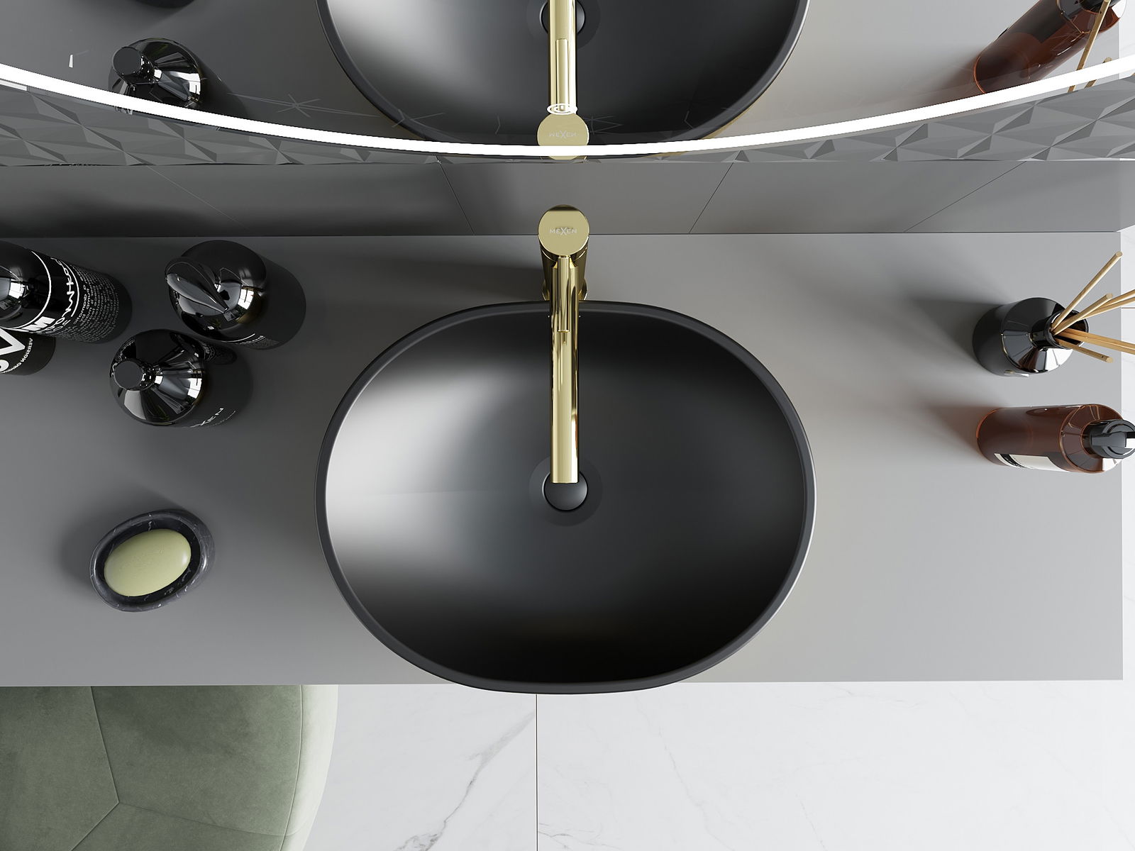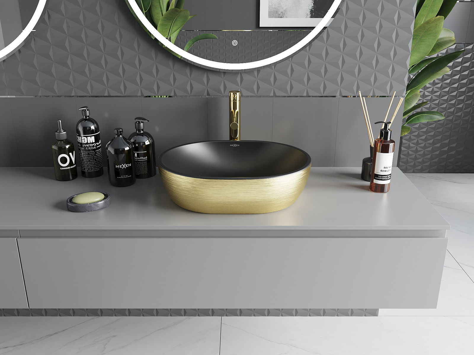 Chiuveta deasupra blatului este soluția ideală pentru interioare moderne. Cu dimensiunile de 48x35 cm și adâncimea de 11,5 cm, se va potrivi excelent în orice baie. Suprafața sa elegantă negru mat cu decor auriu liniar îmbină stilul cu funcționalitatea. Fabricată din ceramică sanitară de înaltă calitate, chiuveta nu este numai estetică, ci și durabilă. Fără orificii pentru baterii și preaplin, are un design minimalist care va sublinia caracterul spațiului tău.
