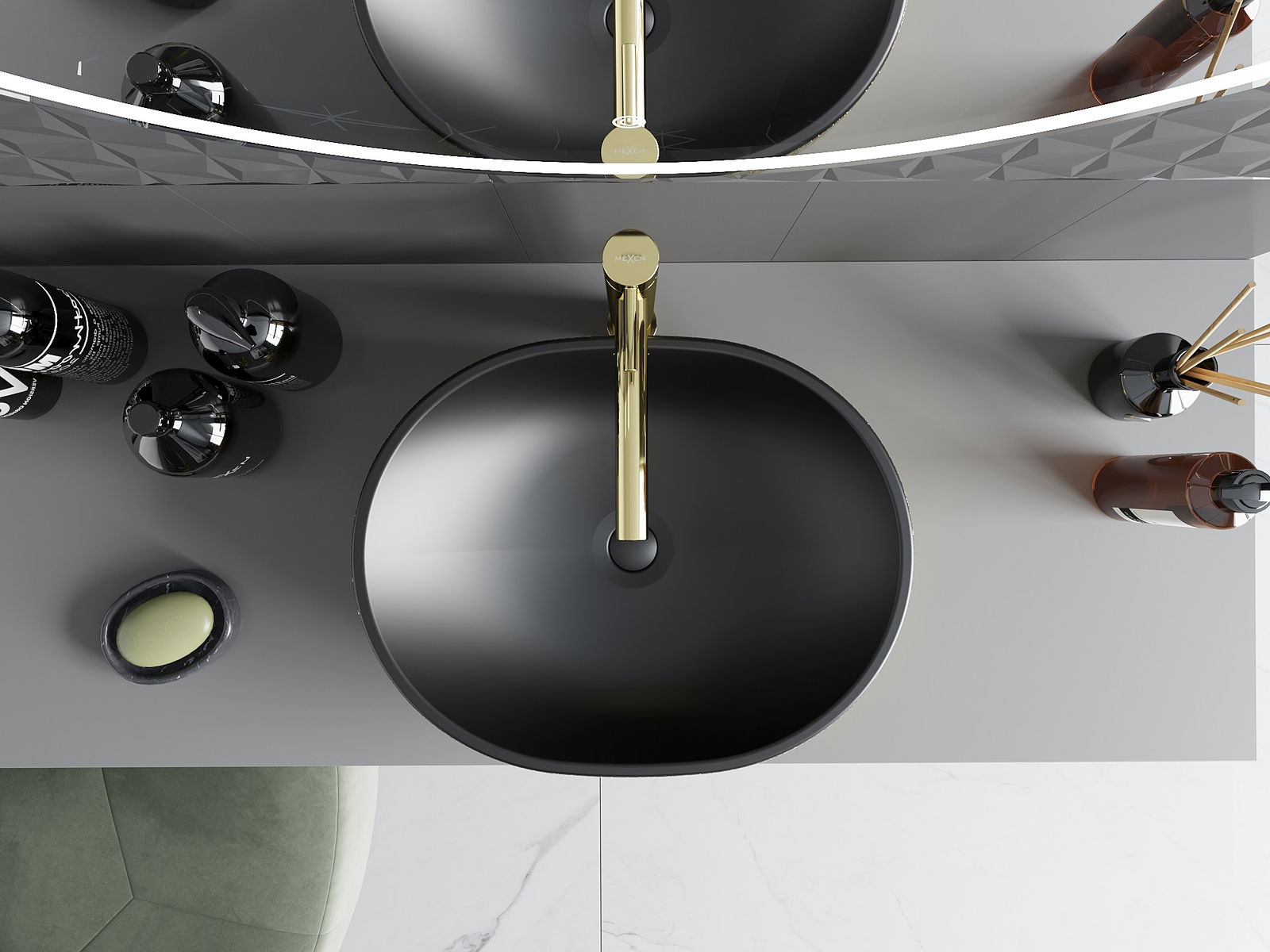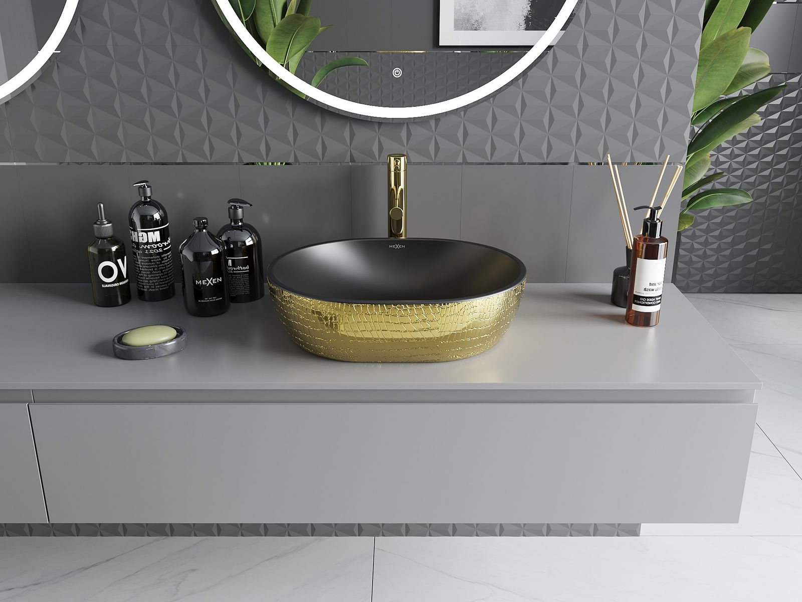 Chiuveta deasupra blatului Mexen Viki este soluția ideală pentru băi moderne. Forma sa ovală și eleganta negru mat cu model auriu scări aduc stil și lux. Dimensiunile 48x35x14 cm și adâncimea de 11,5 cm asigură confortul utilizării. Produsul este realizat din ceramică sanitară de înaltă calitate, cu suprafață lustruită, ceea ce facilitează menținerea curățeniei. În plus, chiuveta nu are orificiu preaplin și nici pentru baterie, permițând aranjamente mai minimaliste.