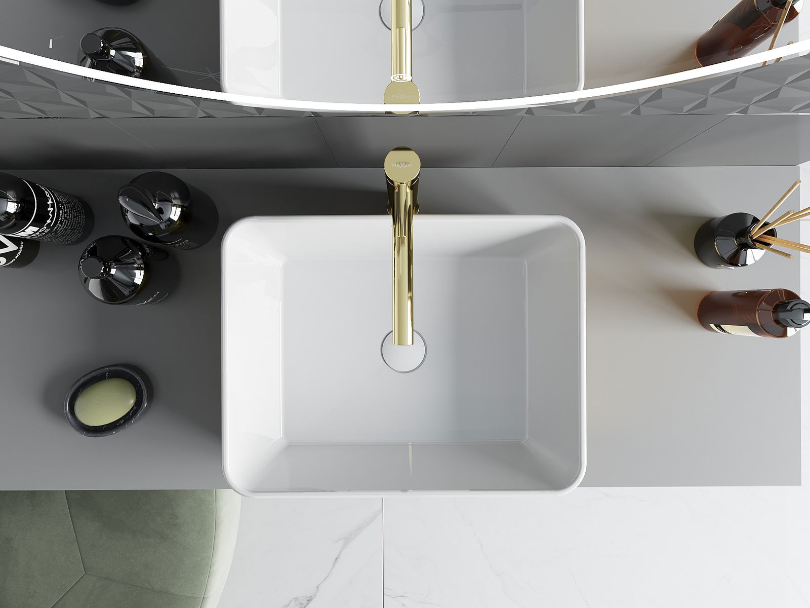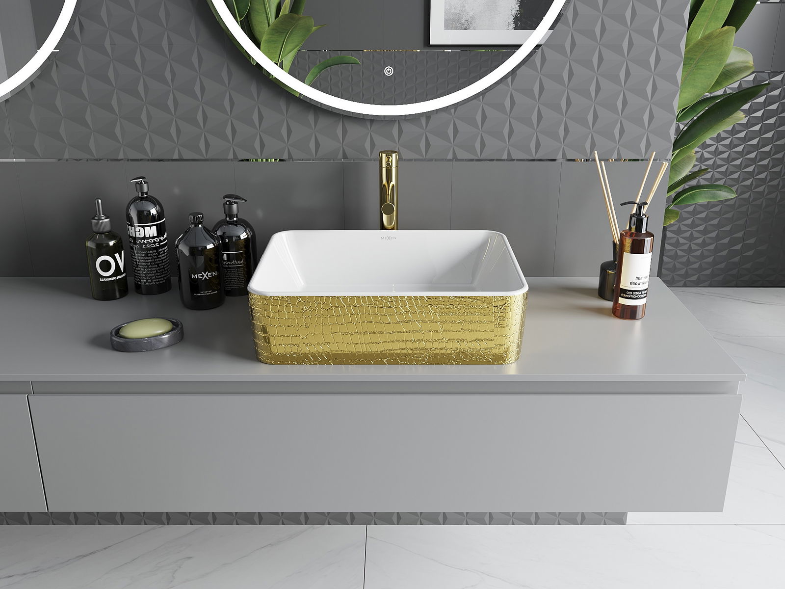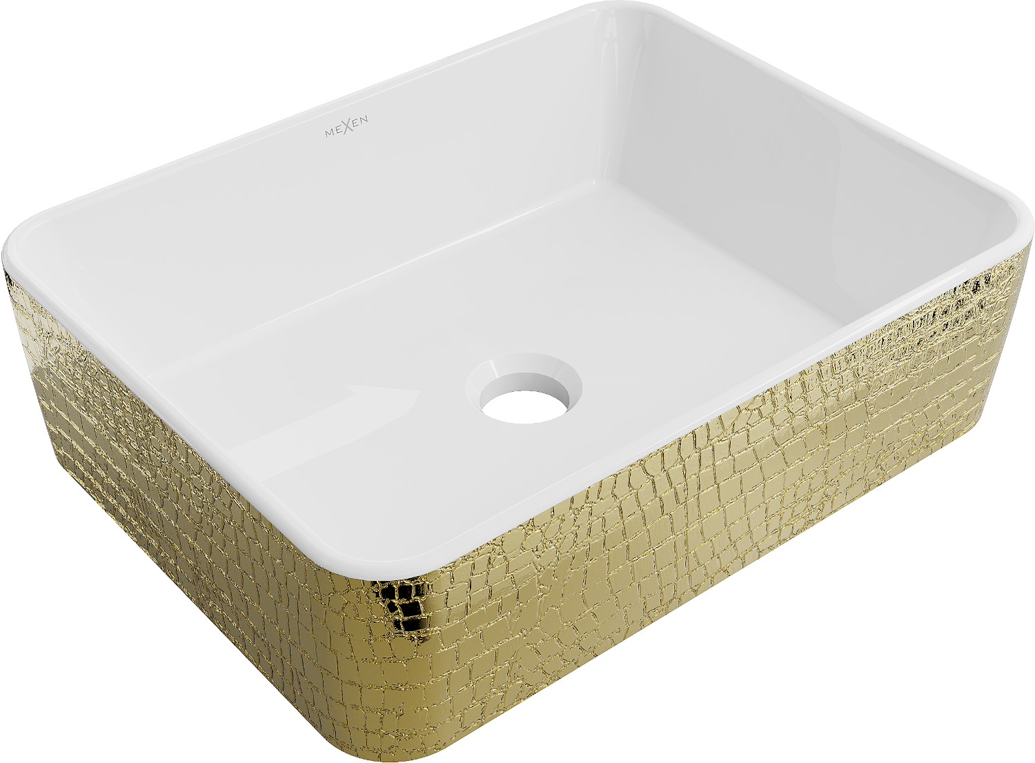 Mexen Catia este un lavoar pe blat elegant, de dimensiune 48 x 38 cm, realizat din ceramică sanitară, care îmbină estetica și funcționalitatea. Modelul său alb-auriu sub formă de solzi conferă băii un caracter unic, iar forma dreptunghiulară adaugă un accent modern. Datorită suprafeței mate și stratului protector, lavoarul este ușor de întreținut și rezistent la zgârieturi. Fără orificii pentru baterii și preaplin, are un aspect elegant, ideal pentru amenajările interioare minimaliste.