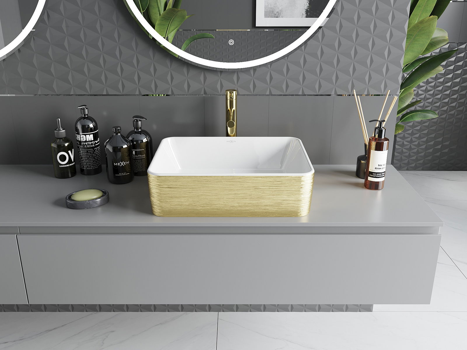 Mexen Catia este o chiuvetă de blat elegantă cu dimensiuni de 48 x 38 cm în culoare albă și aurie, ideală pentru băi moderne. Fabricată din ceramică sanitară de înaltă calitate, se caracterizează printr-o formă dreptunghiulară și o suprafață mată, conferindu-i un farmec deosebit. Lipsa orificiilor pentru baterii și preaplin asigură un design minimalist, iar stratul protector suplimentar mărește durabilitatea. Ideală pentru decorarea interioarelor în stil luxos sau scandinav.