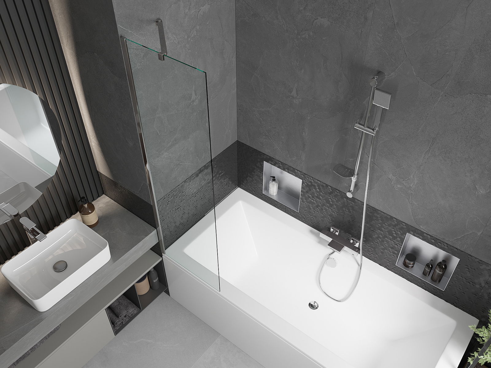 Datorită utilizării unui sistem universal de montare, paravanul poate fi montat pe partea dreaptă sau pe partea stângă, în funcție de necesități. În acest fel, poți proiecta cu ușurință un duș adaptat la spațiul băii.