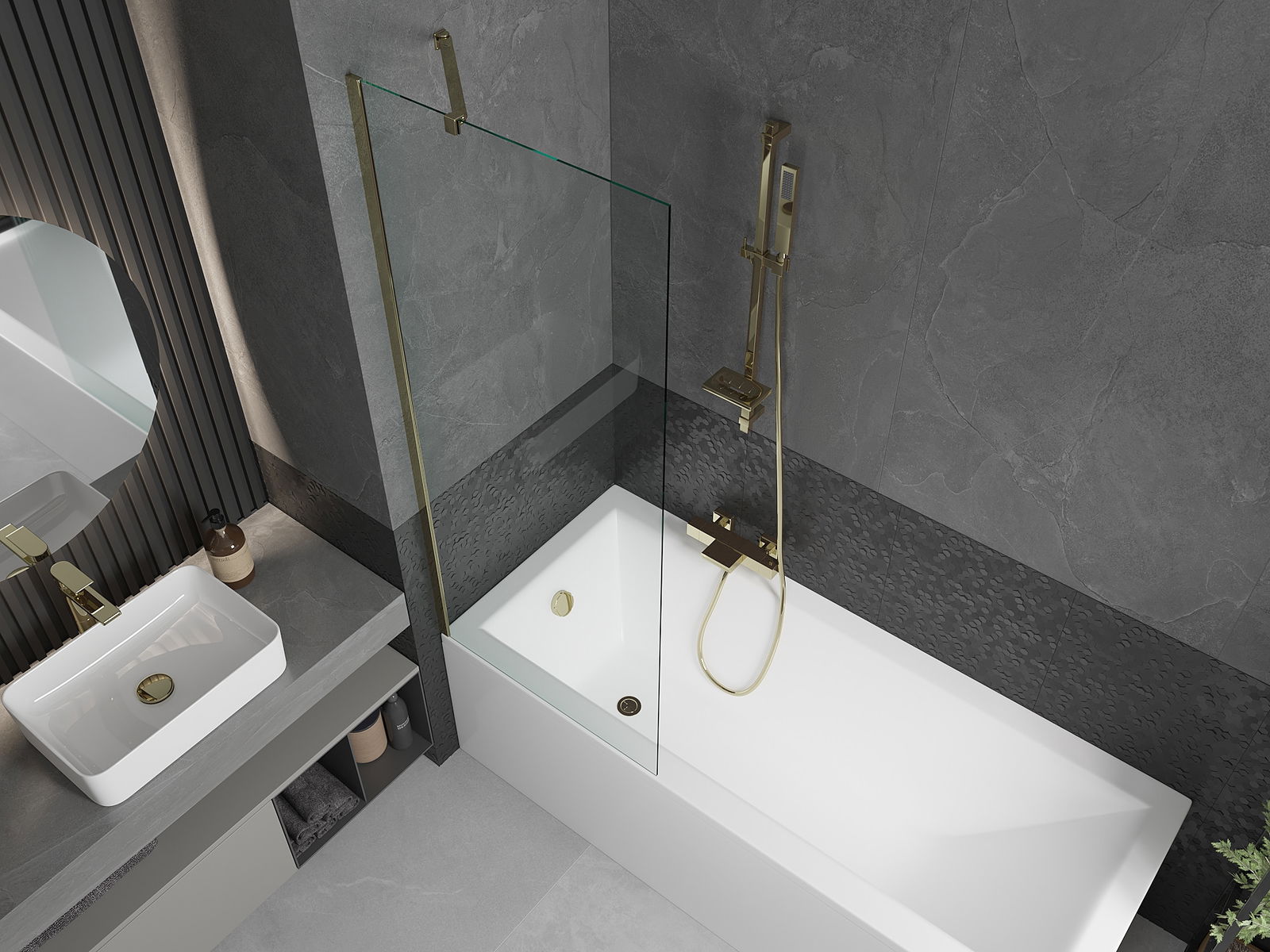 Mexen Cubik cadă dreptunghiulară 170 x 70 cm cu carcasă și paravan cu 1 panou 70 cm, transparent, auriu - 550317070X9507000050