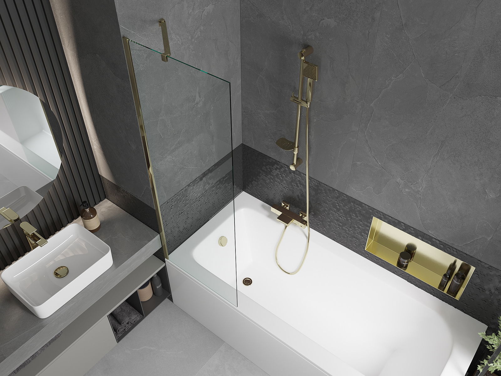 Mexen Vega cadă dreptunghiulară 150 x 70 cm cu panou și paravan cu 1 canat 60 cm, transparent, auriu - 550115070X9506000050