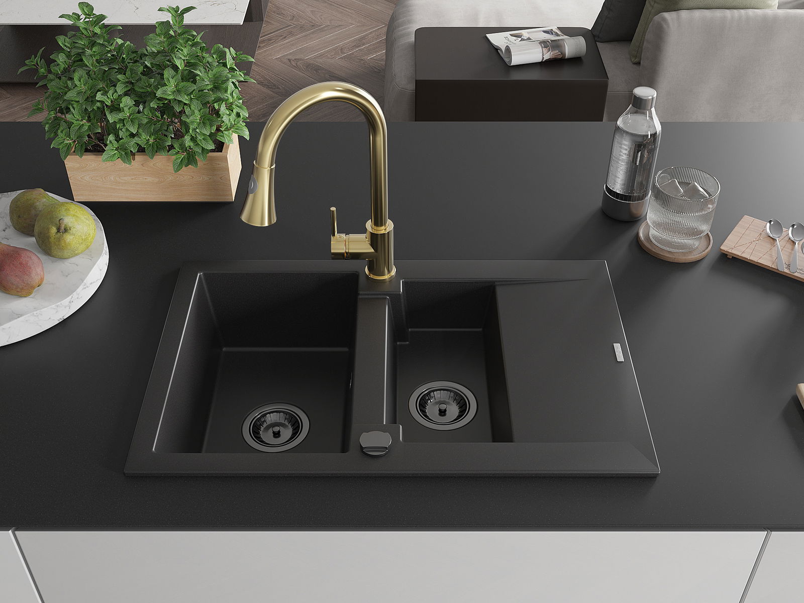 Mexen Gaspar chiuvetă din granit 1,5 camere cu scurgător și baterie de bucătărie Elia, negru - 6507-77-670101-50-B