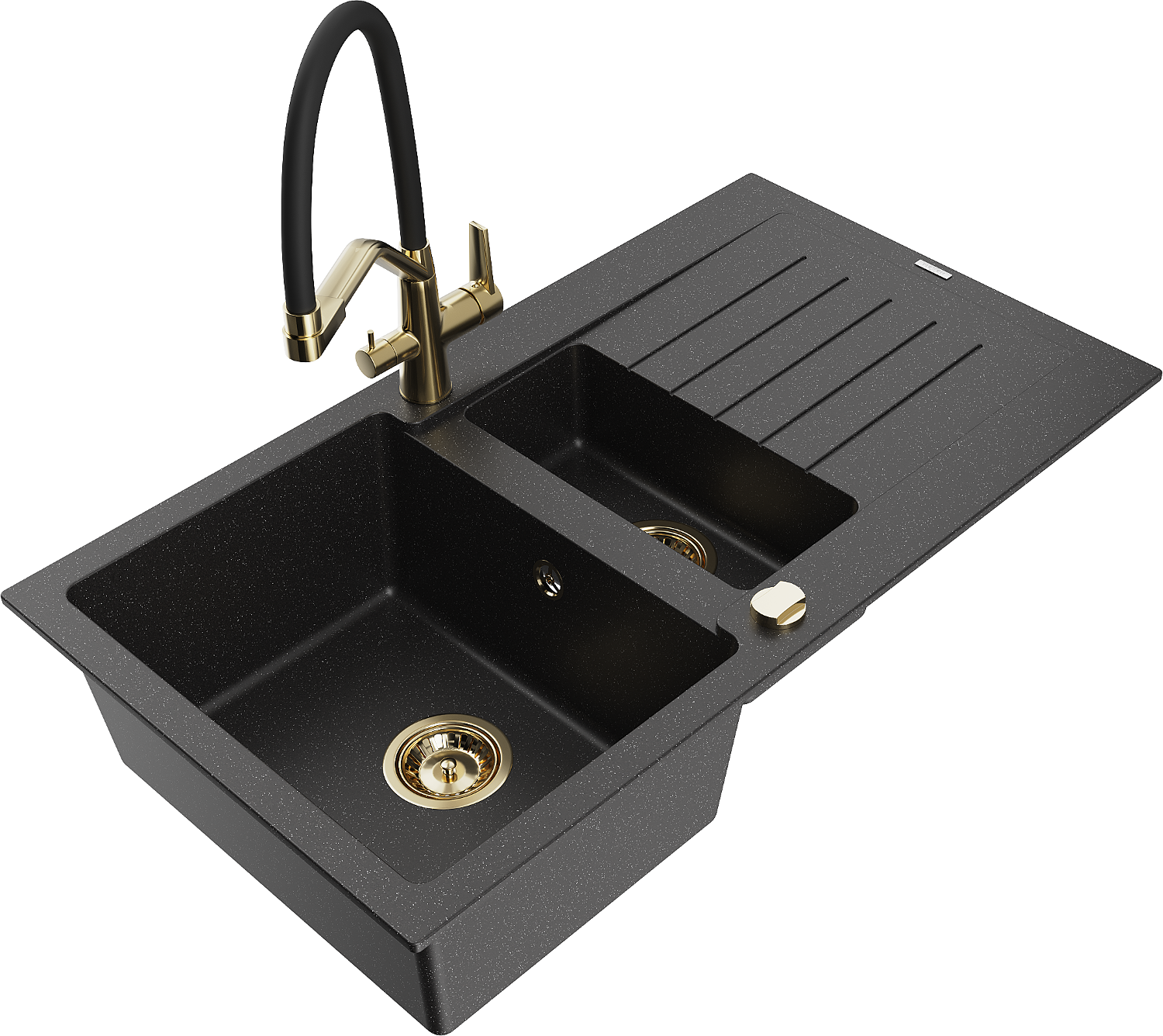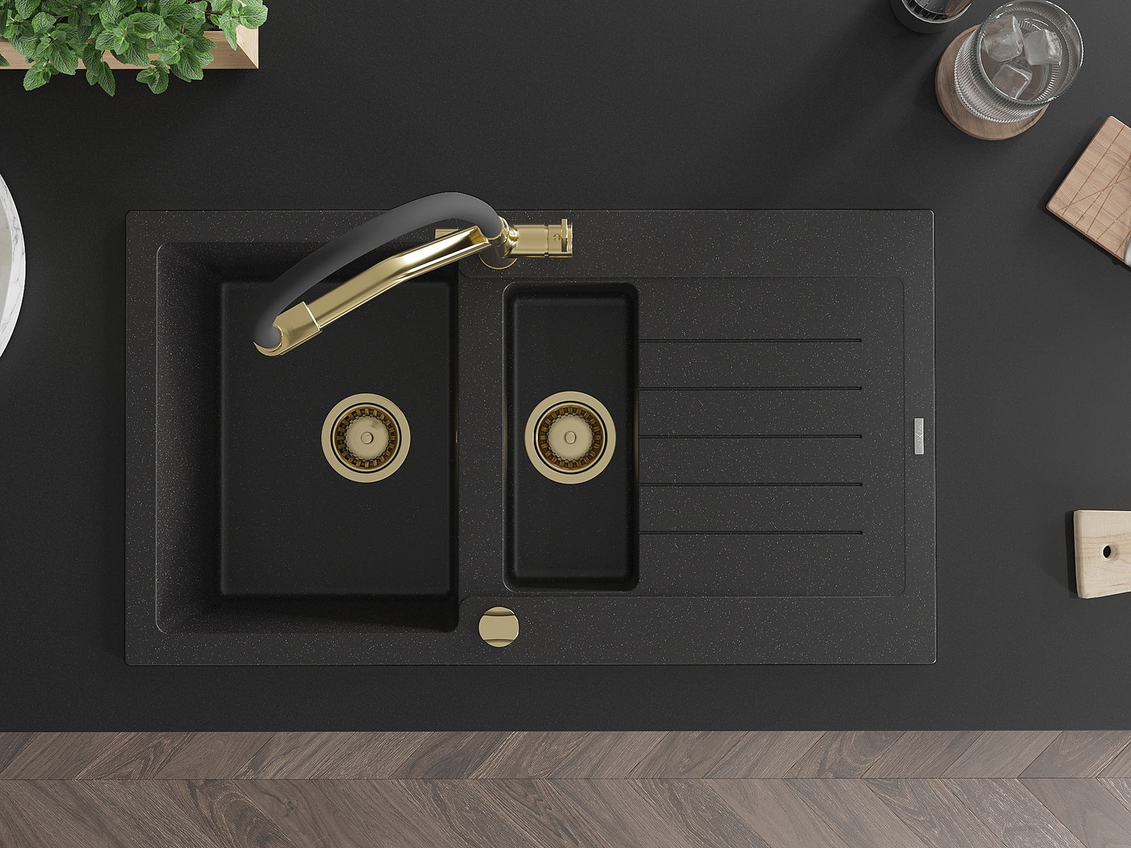 Mexen Matias chiuvetă de bucătărie din granit cu 1,5 boluri cu scurgător și baterie Duo, negru/argintiu - 6502-73-671701-57-G