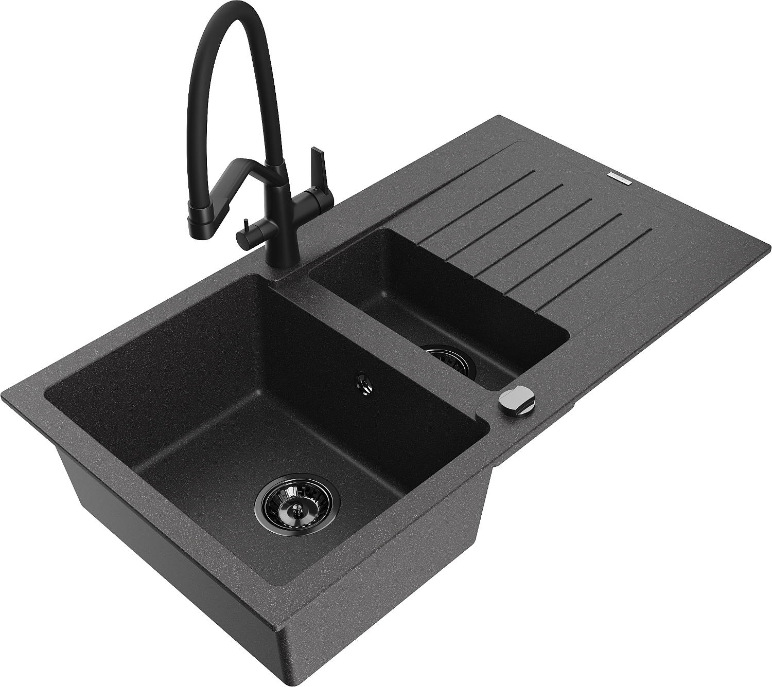 Mexen Matias chiuvetă de granit cu 1,5 compartimente cu scurgător și baterie de bucătărie Duo, negru stropit