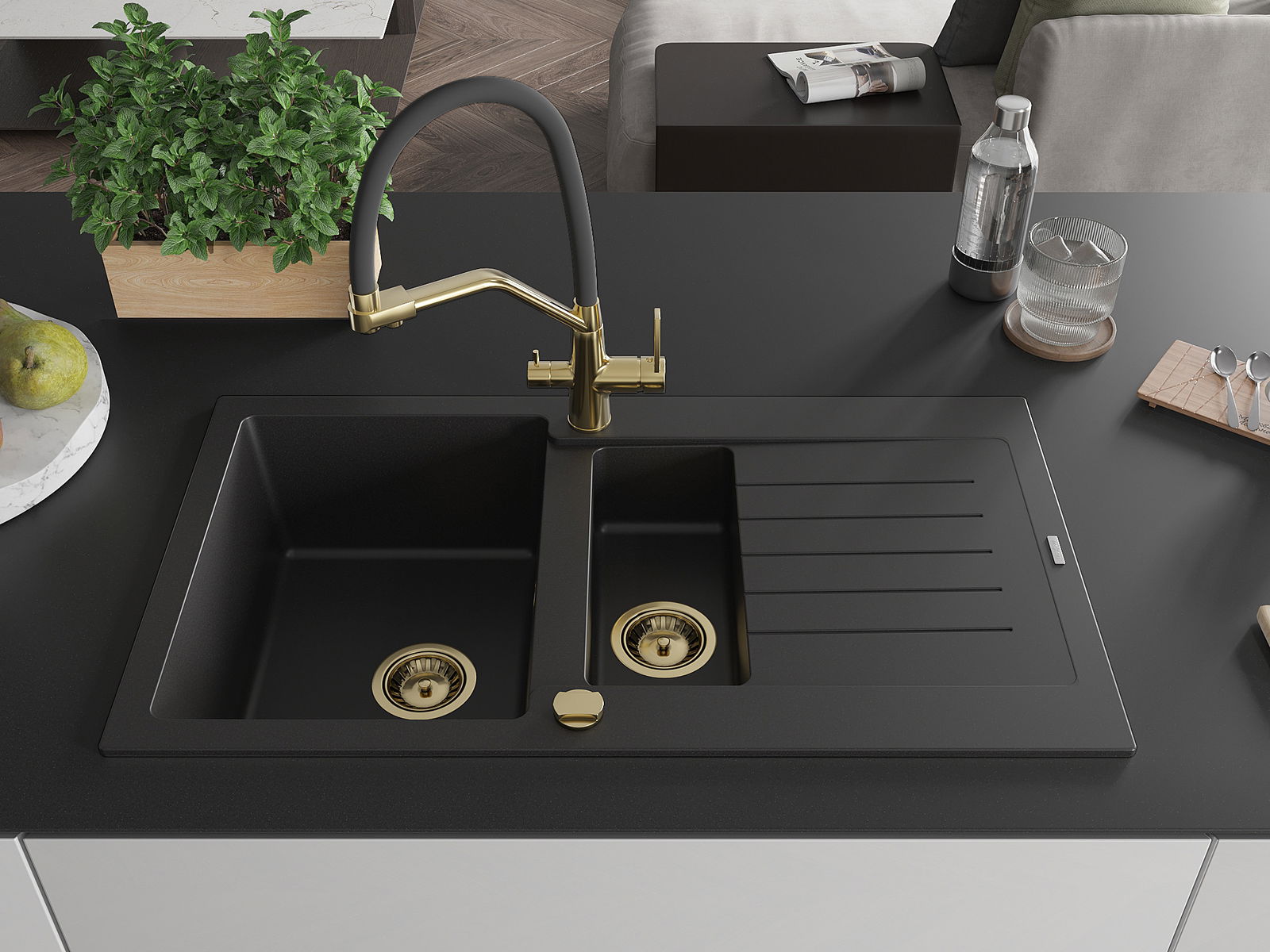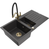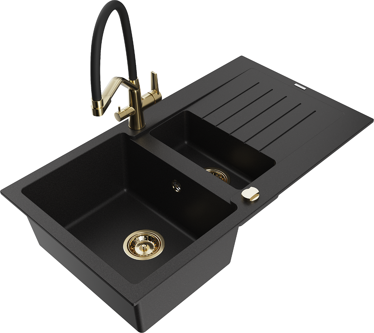 Mexen Matias chiuvetă de bucătărie din granit cu 1,5 camere cu picurător și baterie Duo, negru - 6502-77-671701-57-G