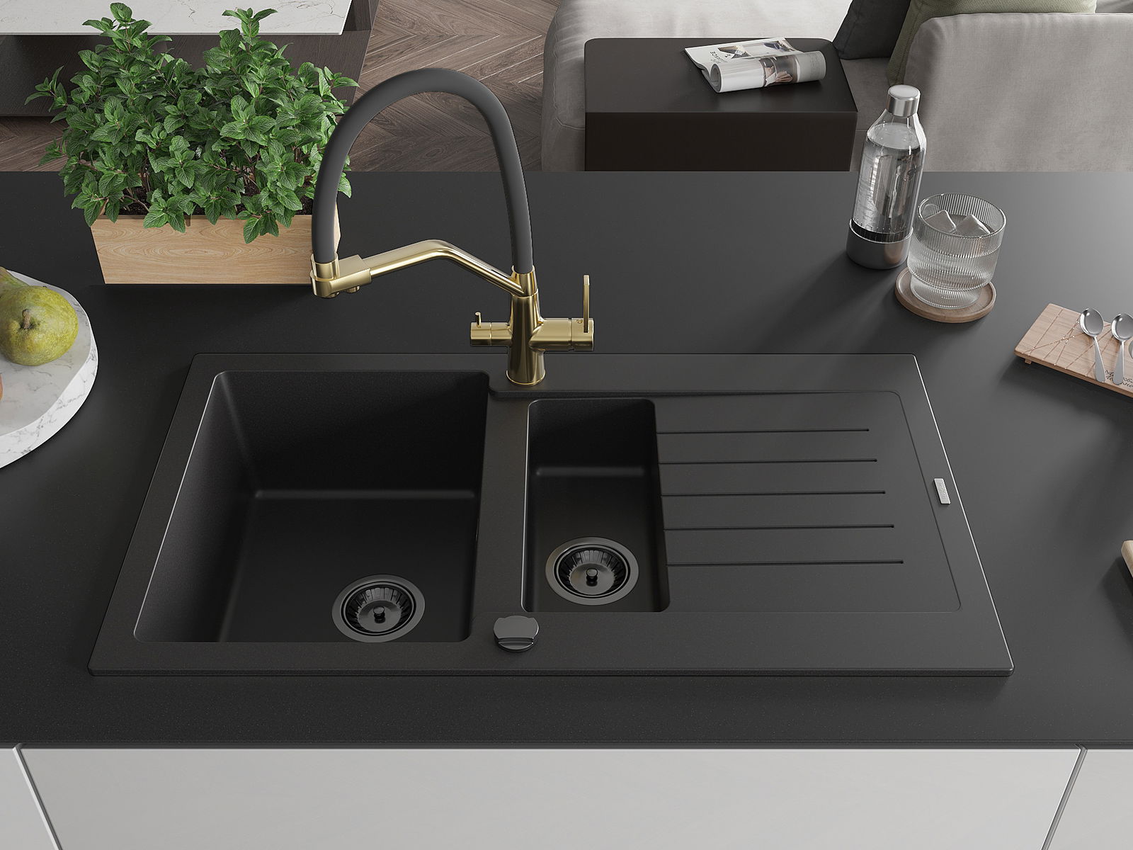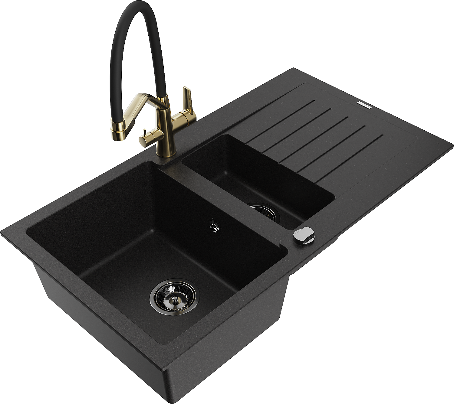 Mexen Matias chiuvetă din granit 1,5-camere cu scurgător și baterie de bucătărie Duo, negru - 6502-77-671701-57-B