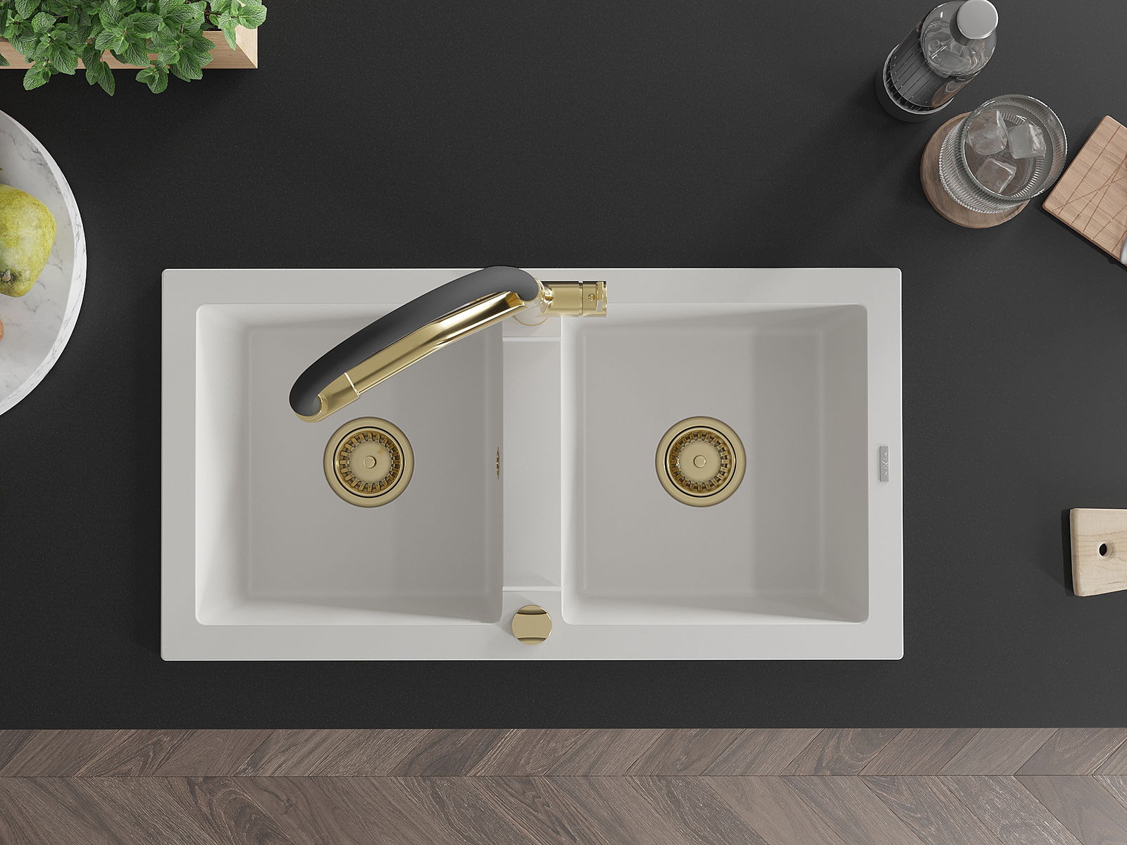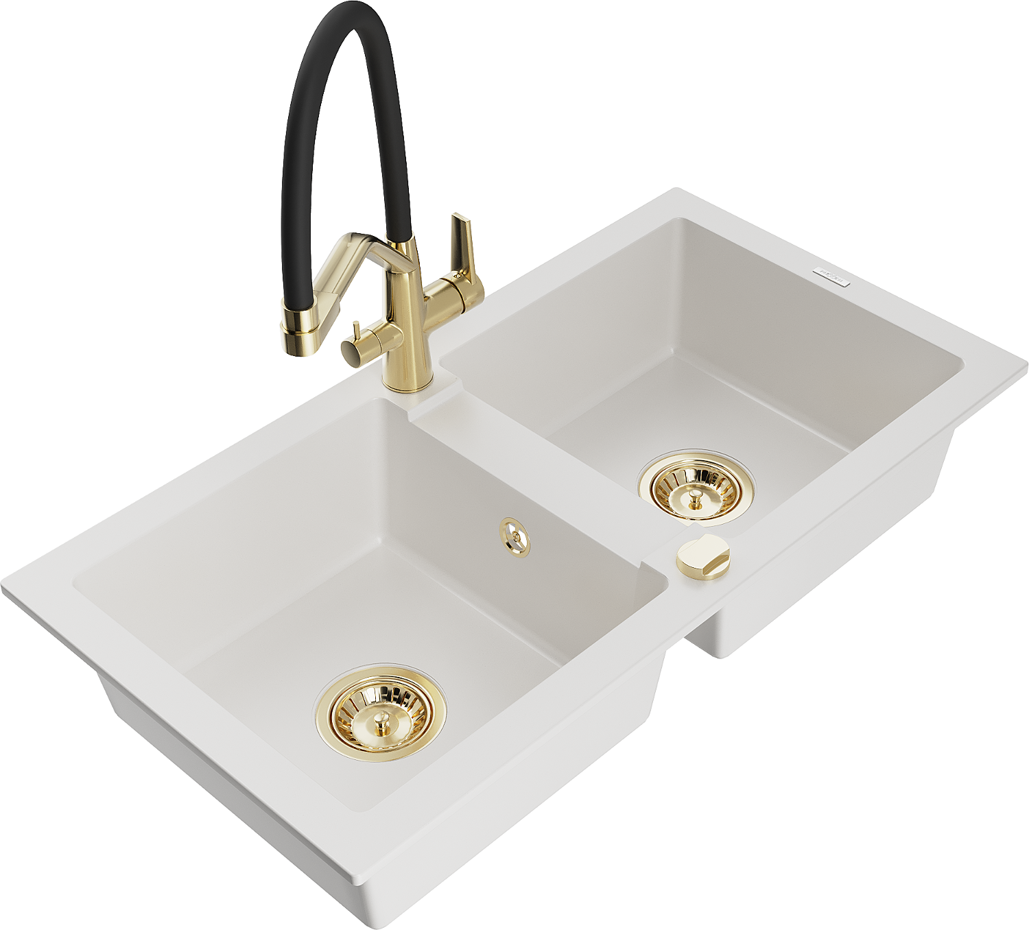 Mexen Mario chiuvetă de granit cu 2 compartimente și baterie de bucătărie Duo, alb - 6504-20-671701-57-G