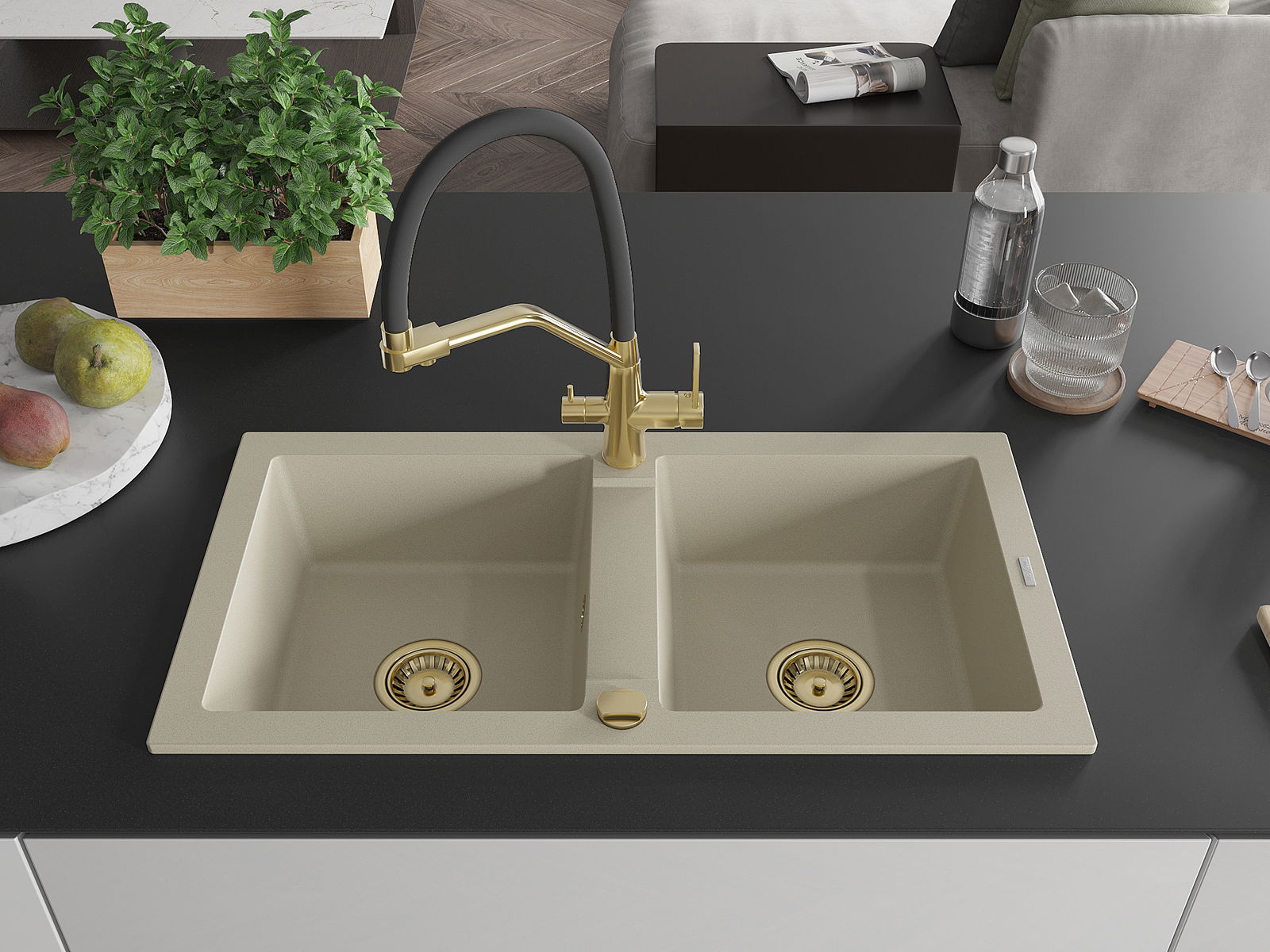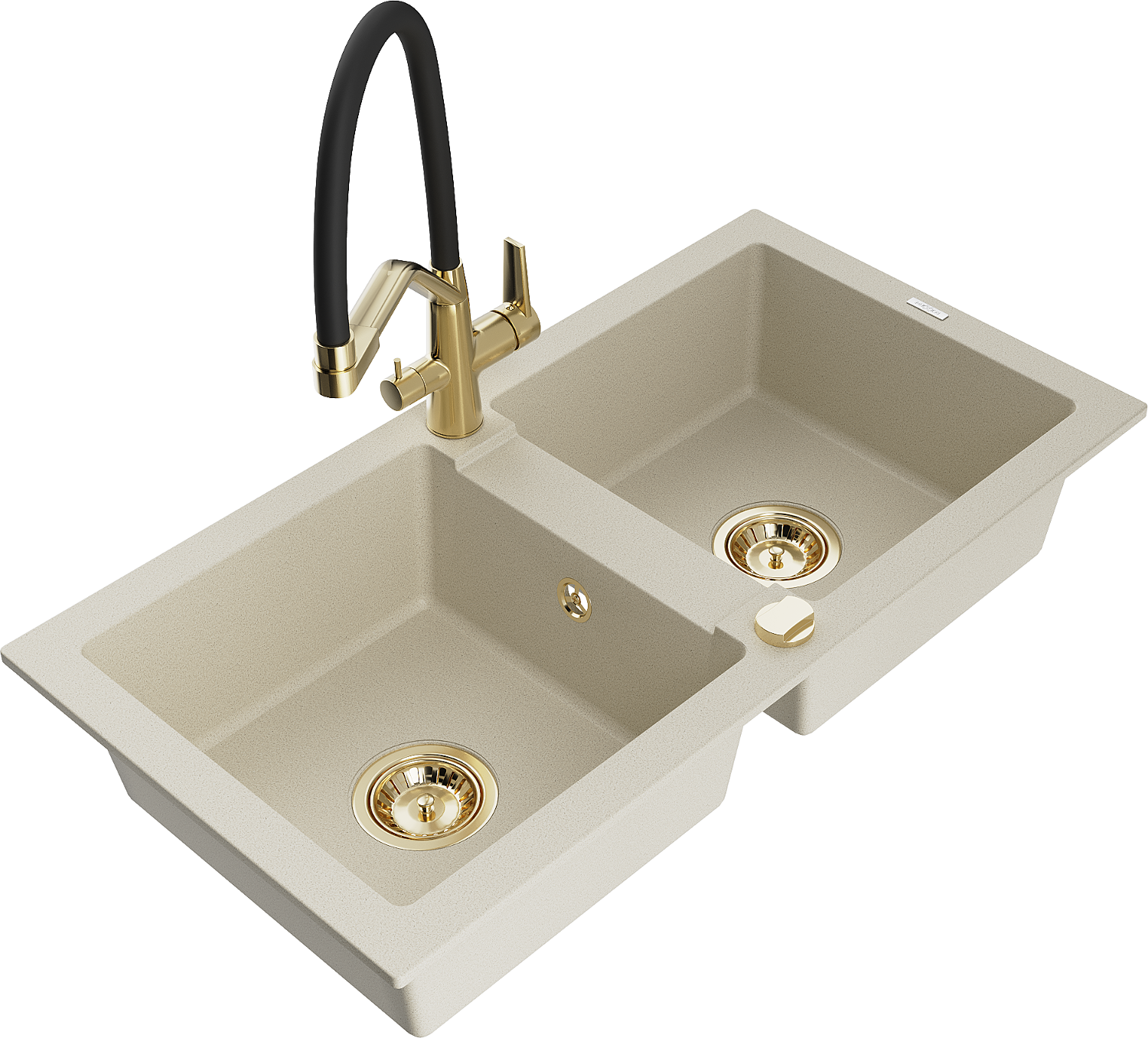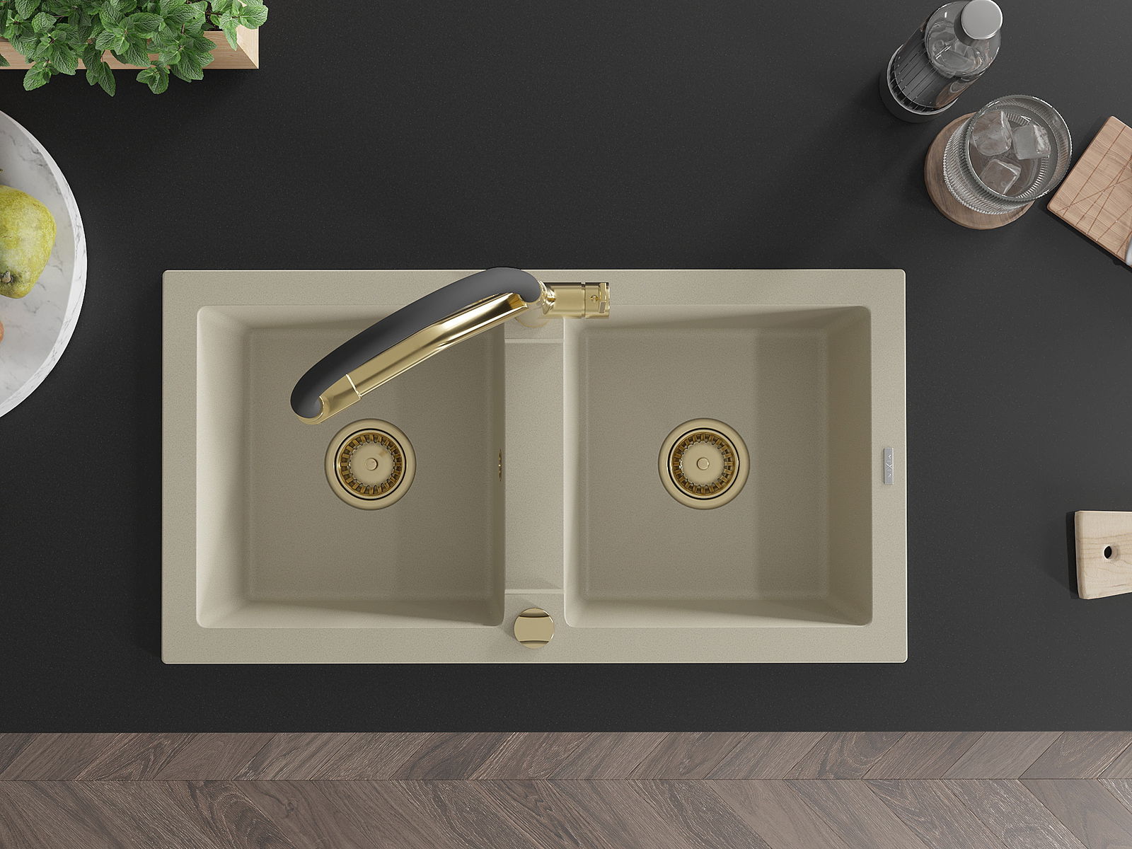 Mexen Mario chiuvetă de bucătărie din granit cu 2 cuve și baterie Duo, bej - 6504-69-671701-57-G