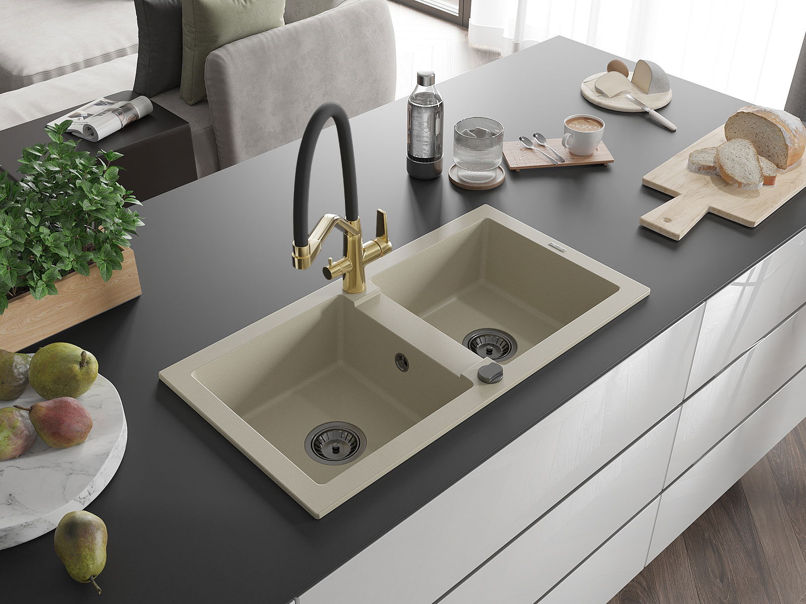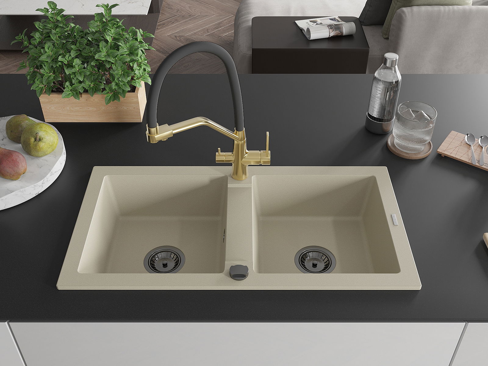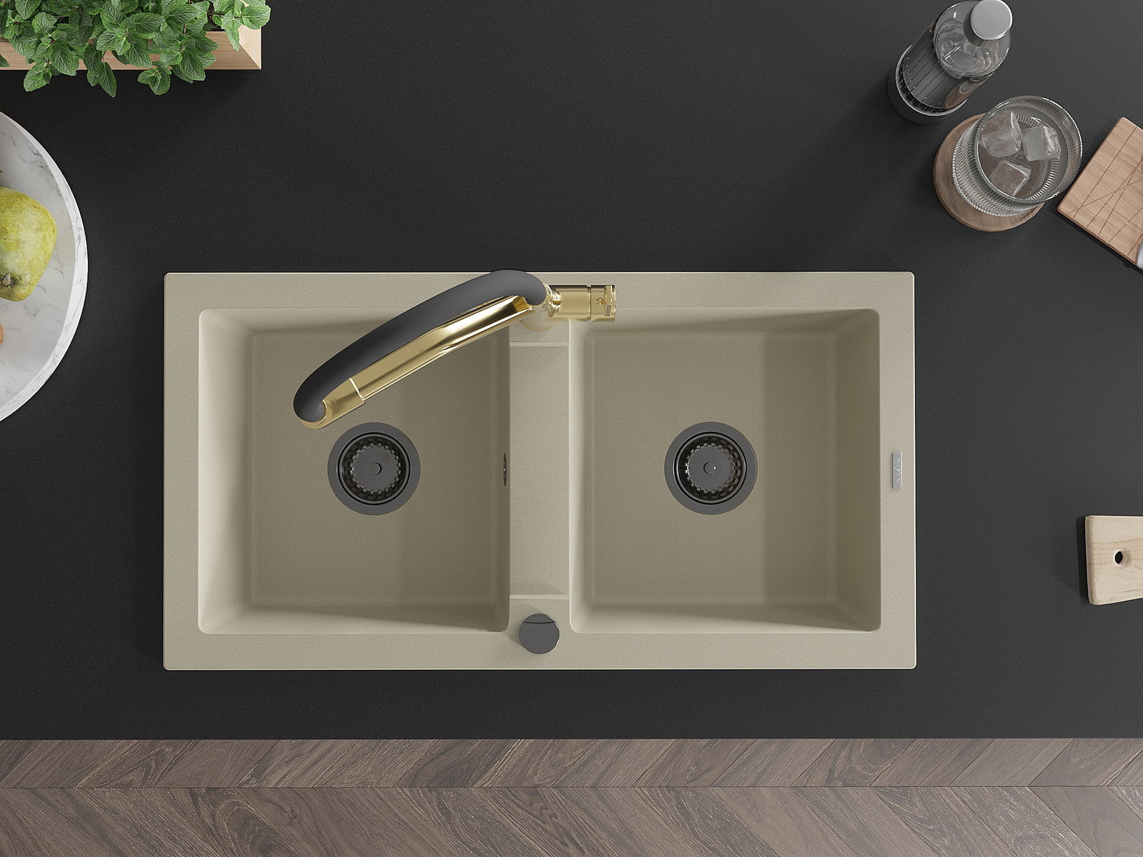 Mexen Mario chiuvetă de granit cu 2 cuve și baterie de bucătărie Duo, bej - 6504-69-671701-57-B