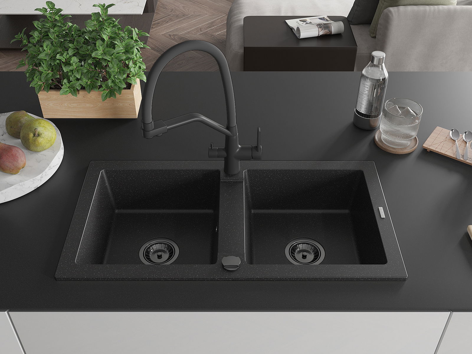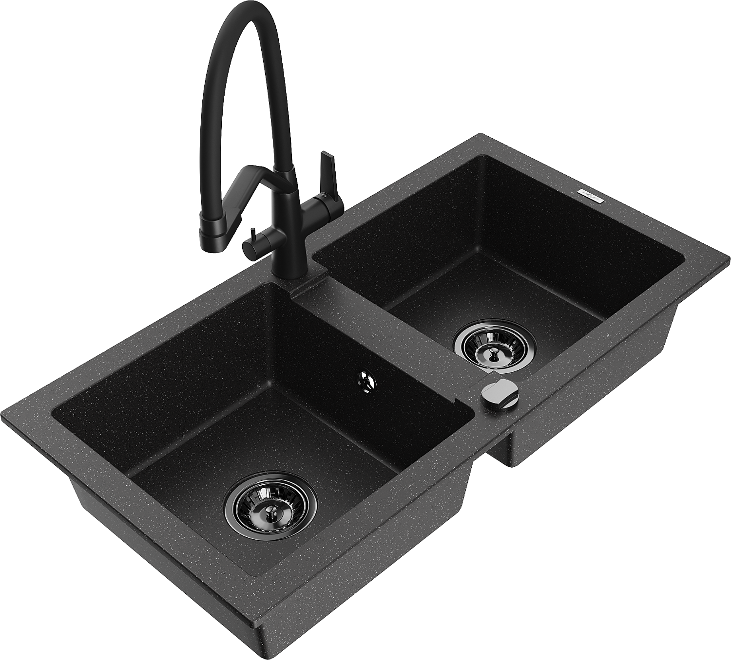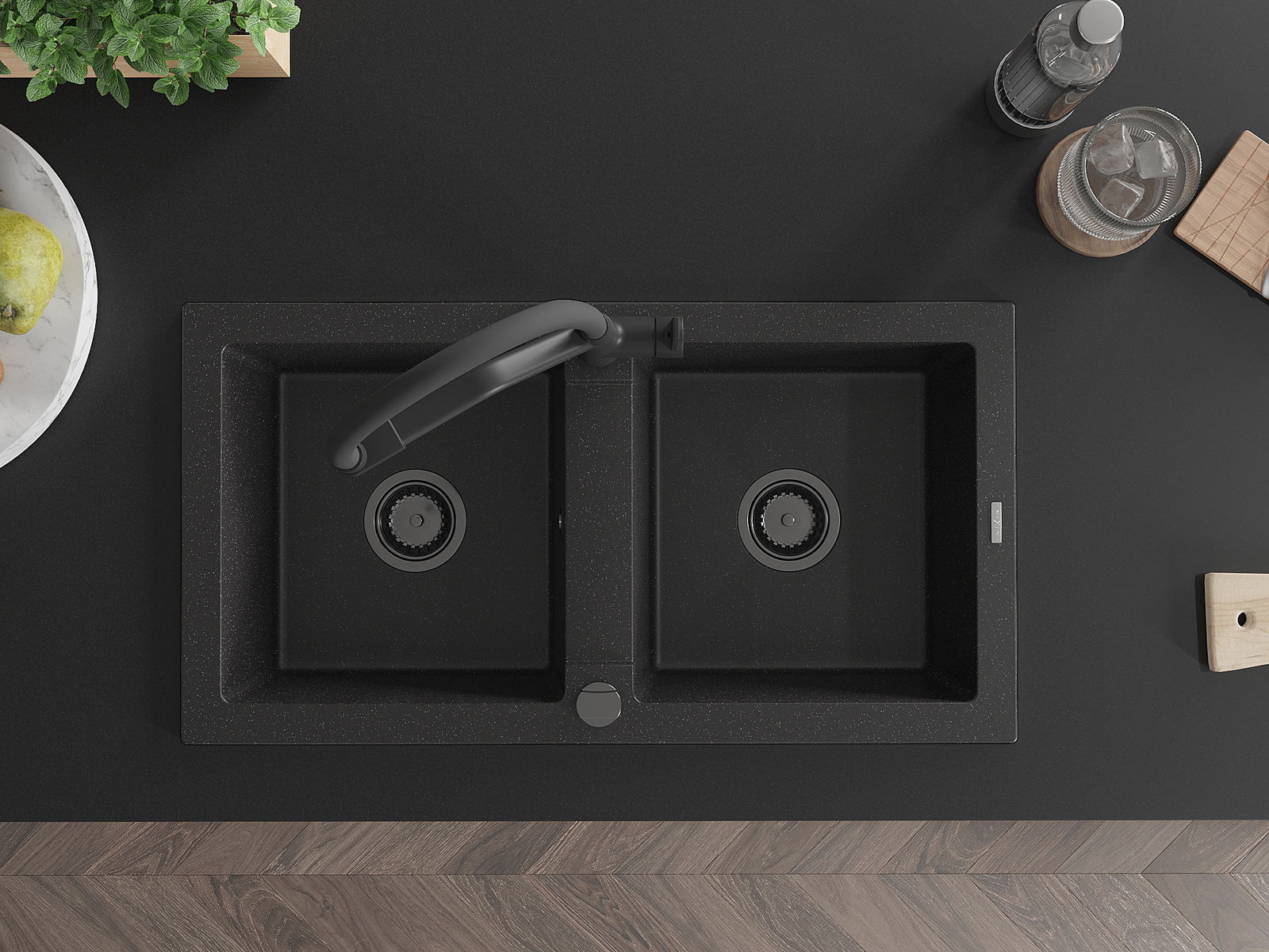 Mexen Mario chiuvetă de granit cu 2 compartimente și baterie de bucătărie Duo, negru/argintiu metalizat - 6504-73-671701-70-B