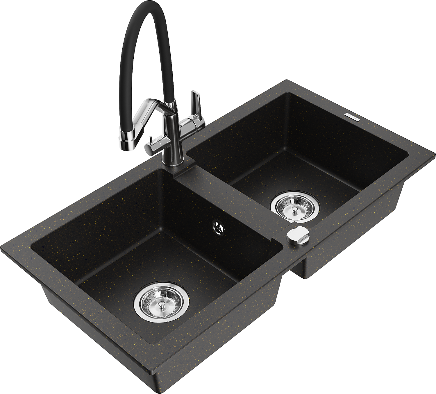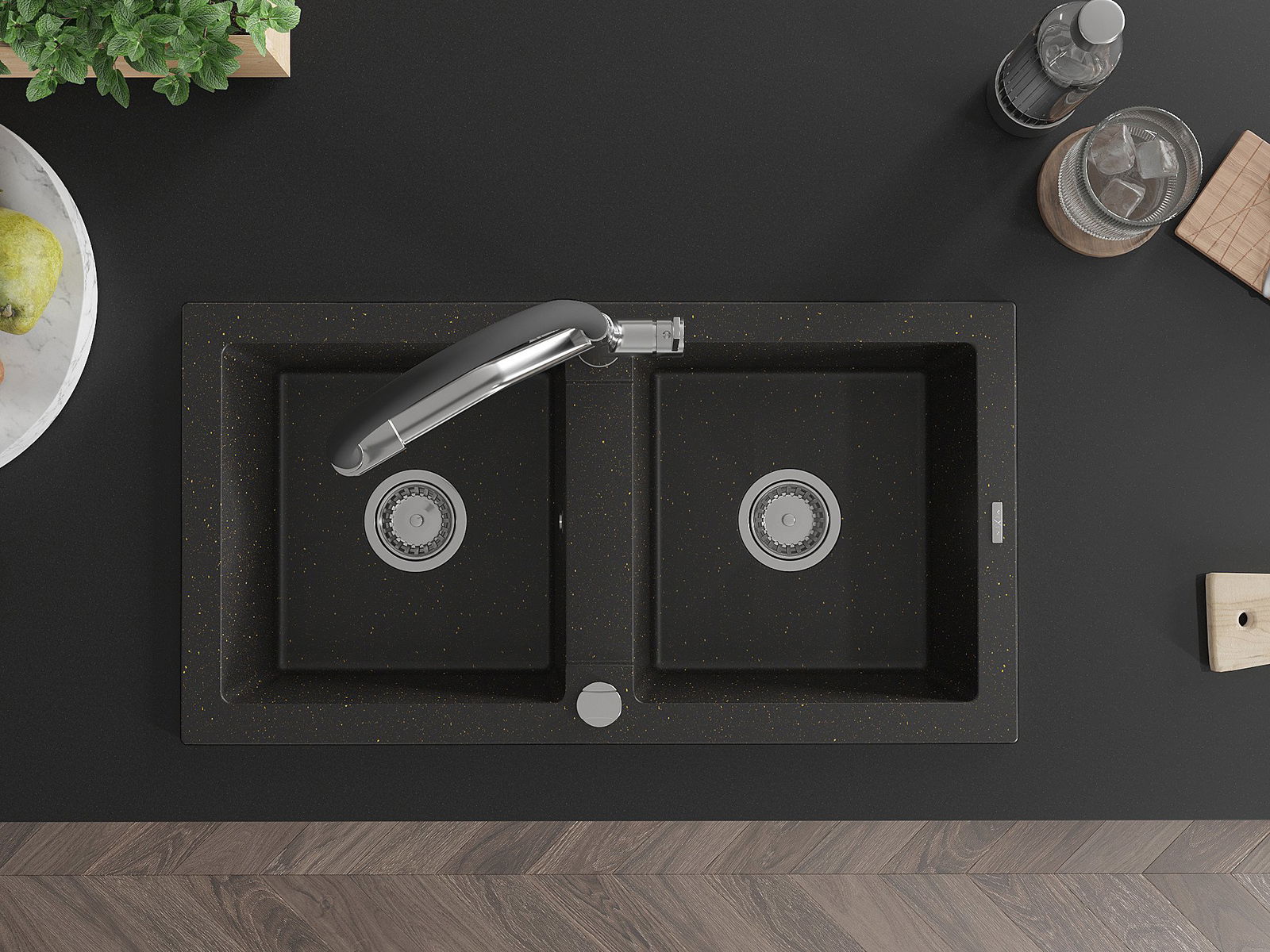 Chiuvetă granit Mexen Mario cu 2 compartimente și robinet de bucătărie Duo, negru/auriu metalizat - 6504-75-671701-07