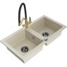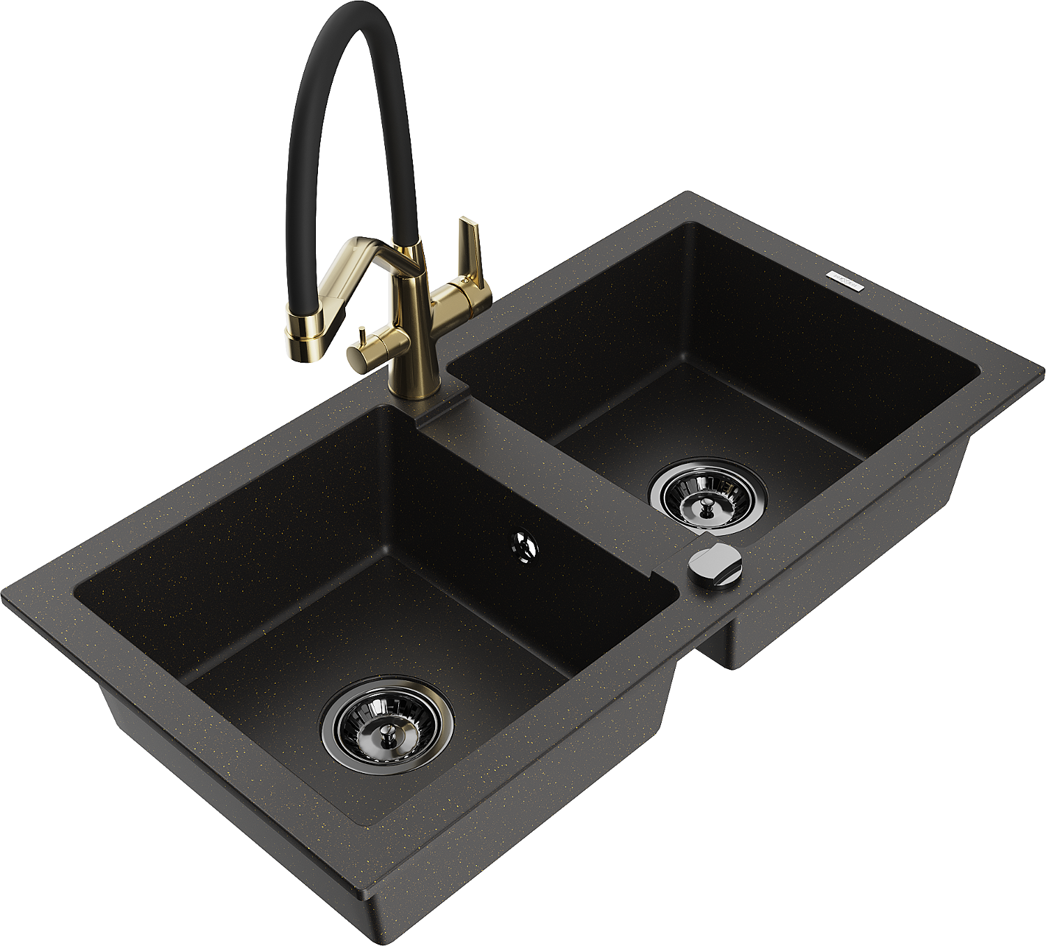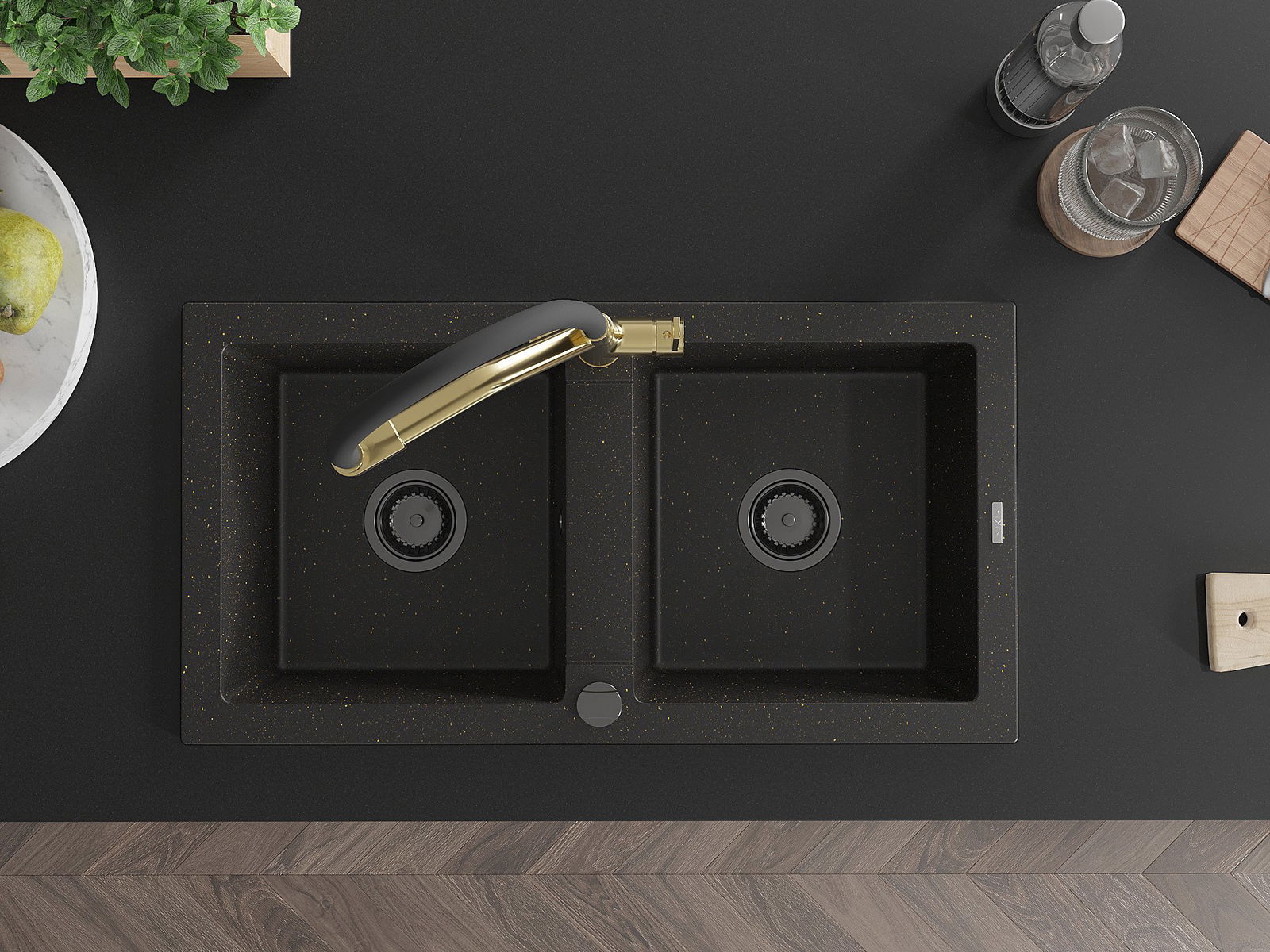 Mexen Mario chiuvetă de granit cu 2 compartimente și baterie de bucătărie Duo, negru/auriu metalic - 6504-75-671701-57-B