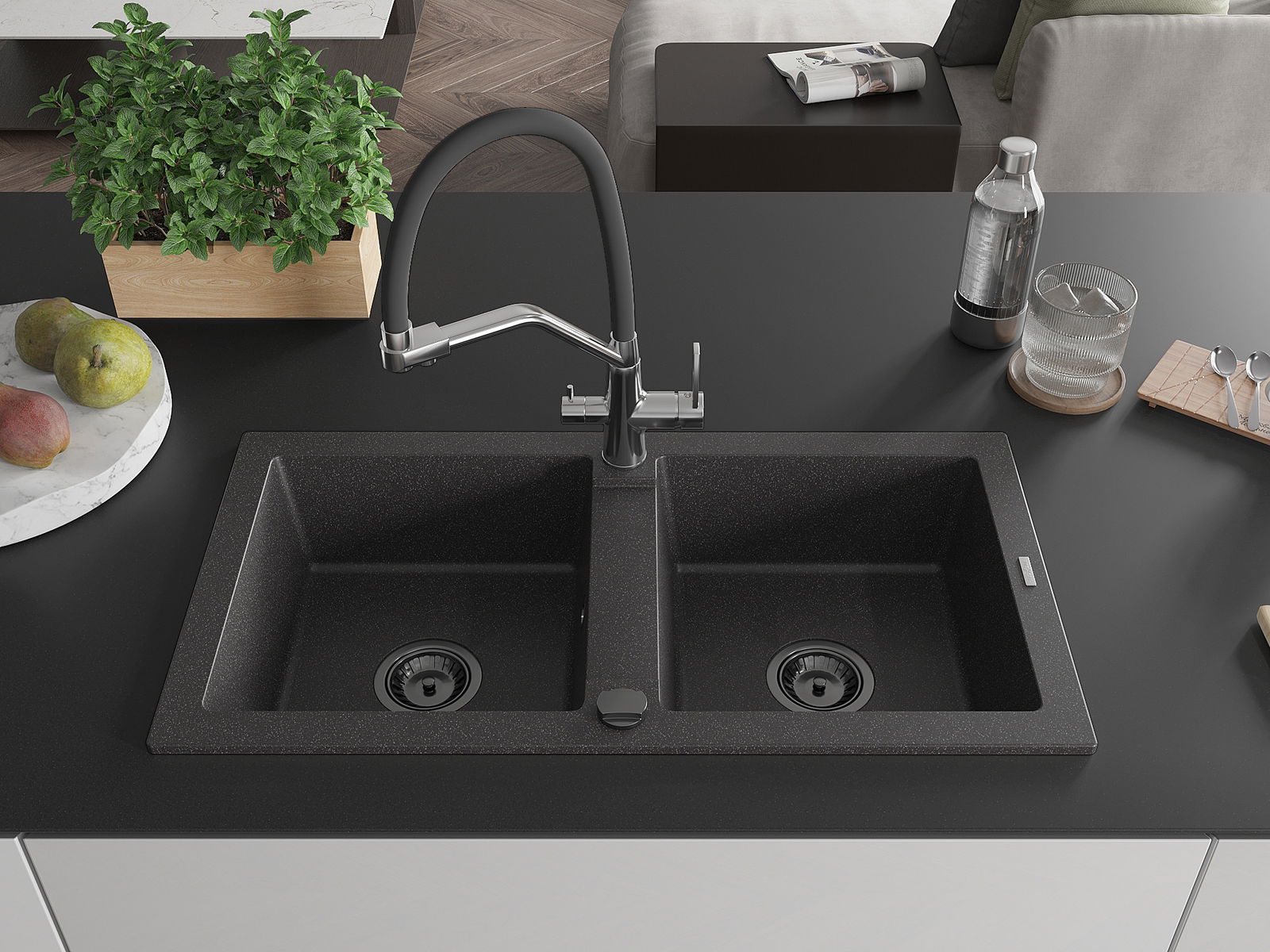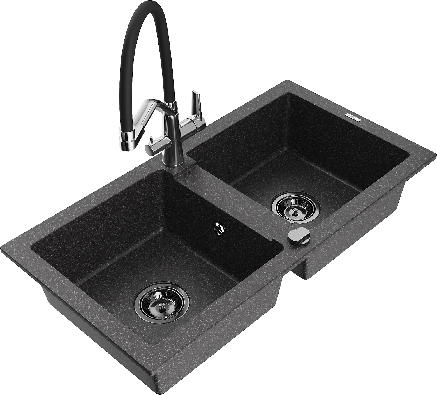 Mexen Mario chiuvetă din granit cu 2 compartimente și baterie de bucătărie Duo, negru cu pete - 6504-76-671701-07-B